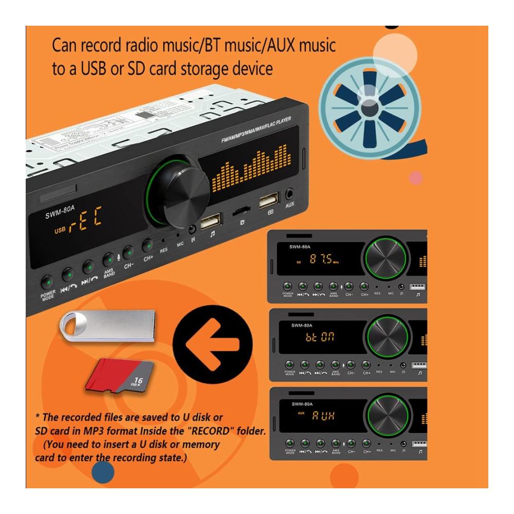Kliplinc Cinch-Audioausgang kann an einen Subwoofer angeschlossen werdenUnterst¨¹tzung der Telefon-App-VerbindungAutofunktion lokalisieren und findenTelefon-Sprachassistent (Sprachsteuerung)Audioquellen-Kopierfunktion LichterSpezifikation:Modell: -80ASpannung: 12VPlattengr??e: 188 x 58 mmFl?chenbeleuchtung: farbenfrohe BeleuchtungTiefe: 60 mmTelefonverbindung: Support, per App auf dem TelefonRadioband: FM/AMLeistung: 60WArbeitstemperatur: -10- 60¡ãCFunkfrequenz: FM 87,5-108MHz/A522-1620KHZSpeicherkartensteckplatz: TF-KartensteckplatzUSB-Anschluss: 2 USB-Anschl¨¹sse (1 Ladeanschluss, 1 USB 2.0-Anschluss f¨¹r Lesen von USB-Sticks)RCA-Buchse: 4-Kanal-Ausgang (rot/wei?e Cinch-Buchsen)Front-AUX-Audioeingang: Unterst¨¹tztes Audioformat: MP3/WMA/WAV/FLACMaterial: MetallFarbe wie abgebildetPackungsinhalt:1 Satz AutospielerNur der oben genannte Paketinhalt, andere Produkte sind nicht enthalten.Hinweis: Wegen der Lichtreflexion und Bildschirme k?nnte der Farbeton in den Fotos sowie des tats?chlichen Produkts etwas unterschiedlich sein. Der erlaubte Messfehler ist /- 1-3 cm.
