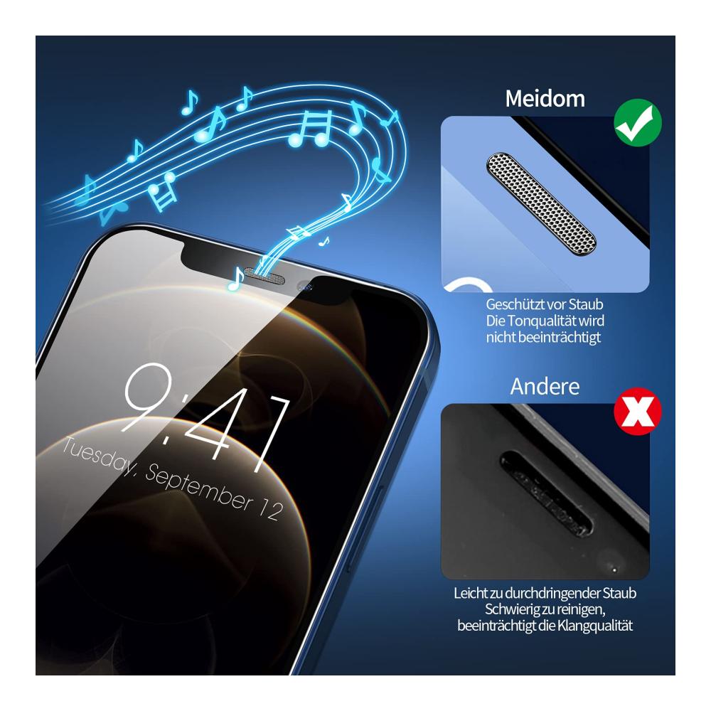 Face-ID KompatibelEs ist vollständig auf das iPhone 12 Pro Max zugeschnitten und beeinträchtigt die Gesichtserkennung nicht. | Halten Sie den Bildschirm sauberDie hydrophobe und oleophobe Beschichtung des gehärteten Meidom Schutzfolie reduziert Ölflecken und Fingerabdrücke und kann leicht gereinigt werden, um den Bildschirm sauber zu halten. | Anti KratzEs ist keine weiche Folie, sondern ein hartes Glas. Meidom schutzfolie kompatibel mit iphone 12 Pro Max kann Ihr iPhone effektiv vor unerwünschten Schrammen und Kratzern durch Messer, Schlüssel und einige andere harte Substanzen aus Ihren Taschen schützen. | Empfindliche BerührungDie Oberfläche ist glatt und fühlt sich echt an. Leicht Genießen Sie das Vergnügen von 0 Distanz Kontakt mit dem Telefonbildschirm! |