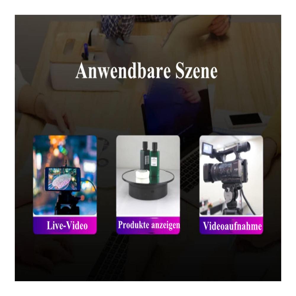 Entdecken Sie den elektrischen Drehteller Plattenspieler mit 360-Grad-Drehtisch für Ihre Fotografie- und Schmuckpräsentationen! Dieser Ausstellungsstand bietet eine automatische Drehplattform mit sanfter Rotation in beide Richtungen. Sein leiser Betrieb und hochwertiges Material machen ihn ideal für professionelle Fotografie und Live-Videos. Genießen Sie eine ruhige Anzeigeumgebung mit diesem hochwertigen Produkt. Perfekt für Ausstellungen, Kosmetik, Accessoires und mehr