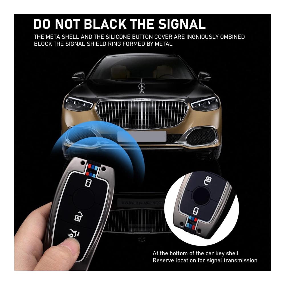 Unser Zinklegierung Autoschlüssel Cover ist maßgeschneidert für Mercedes-Benz Fernbedienungen. Es bietet eine vollständige 360-Grad-Abdeckung und schützt Ihren Schlüssel effektiv vor Beschädigungen, Staub und Kratzern. Die hochwertige Zinklegierung und Silikonmaterialien sorgen für Stil und Langlebigkeit. Erhältlich in drei Farben und präsentiert in einer eleganten Geschenkbox, ist es das perfekte Geschenk für Familie und Freunde. Die einfache Installation und das wissenschaftliche Hohldesign gewährleisten eine leistungsstarke Signalübertragung für ein reibungsloses Erlebnis.