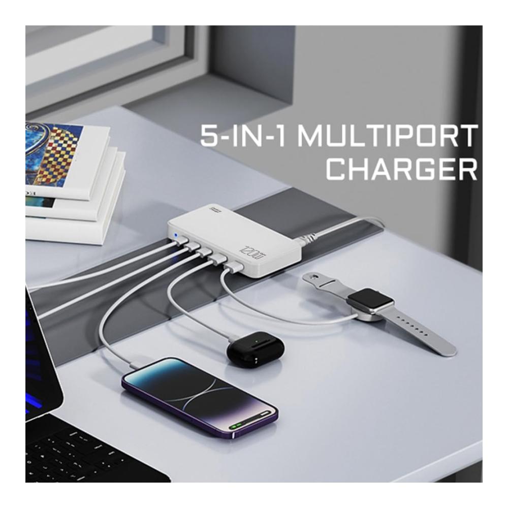 Unser leistungsstarkes 120-W-USB-Typ-C-Ladegerät ist die ideale Lösung für die gleichzeitige Aufladung mehrerer Geräte. Mit 6 Anschlüssen und einer praktischen Desktop-Ladestation ist dieses Ladegerät perfekt für Pro Max-Geräte und bietet zusätzlich ein PD 100-W-Schnellladegerät für Laptops.