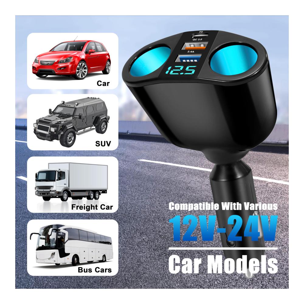 Mehrfachschnittstellendesign: Die Zigarettenanzünder-Adapterbuchse verfügt über 2-USB- und 1-PD- und 2-Zigarettenanzünderbuchsen, die mehrere Geräte gleichzeitig schnell aufladen können.