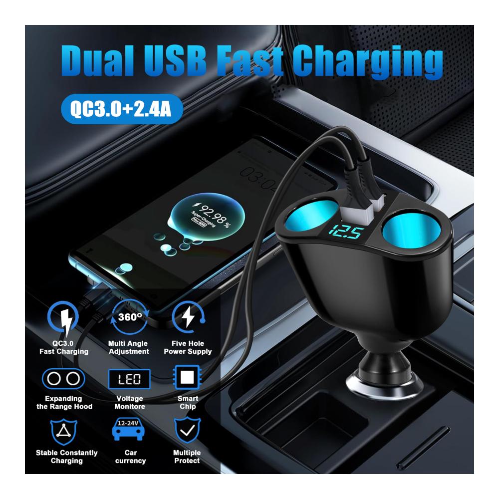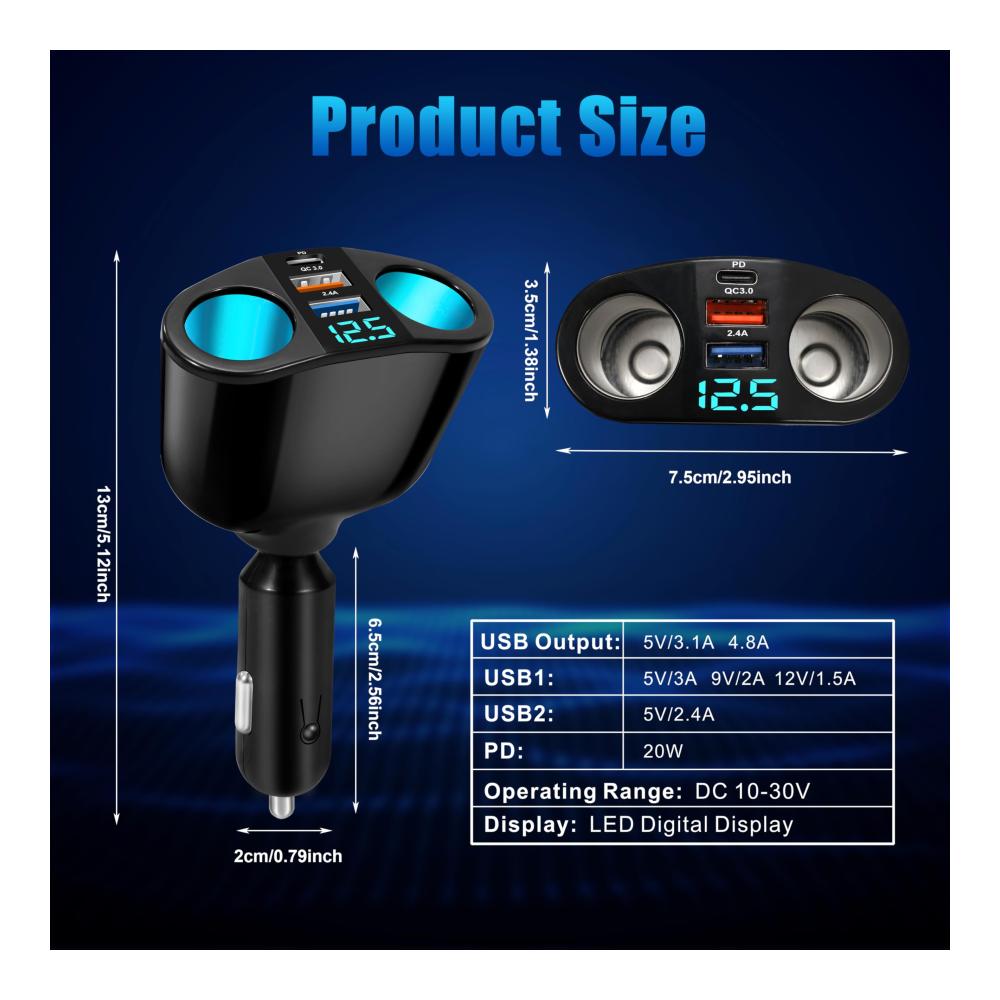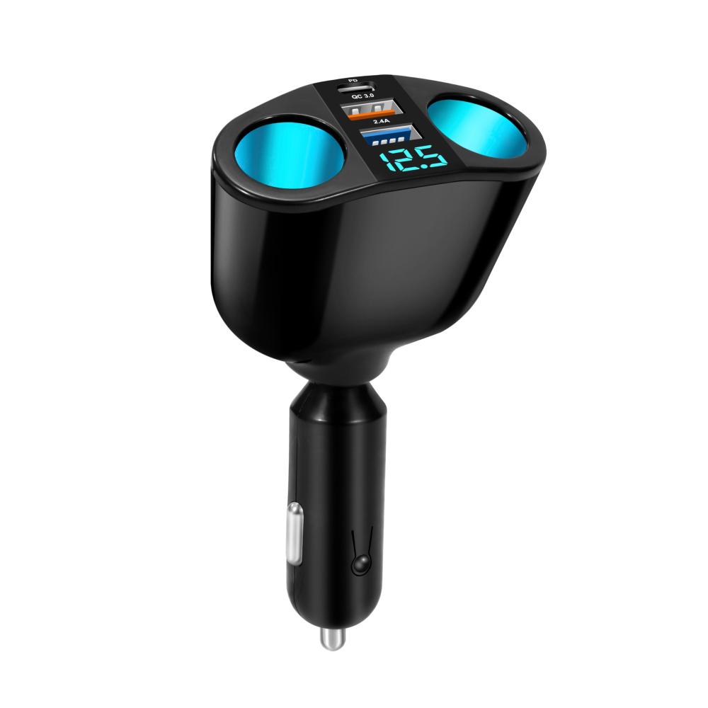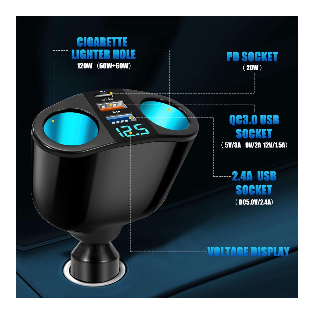 Produktparameter: Eingangsspannung: 12V-24V, Zigarettenanzünderleistung: 120W (60W 60W), USB1 Ausgang: DC5.0V/2.4A, USB2 (QC3.0) Ausgang: 5V/3A, 9V/2A, 12V/1.5A, PD Leistung: 20W.