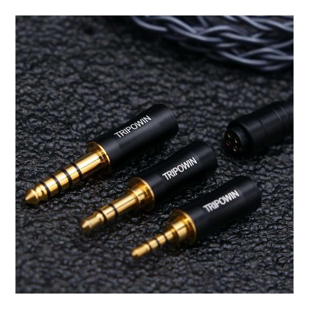 【3-in-1 Cable (changeable 3.5mm/2.5mm/4.4mm plug Included)】Tripowin Noire adopts the 3-in-1 (3.5mm/2.5mm/4.4mm plug) lightweight gold-plated plug exclusively developed and designed by Tripowin, which is refined and practical, allowing you to switch between any of your favourite single-ended or balanced devices