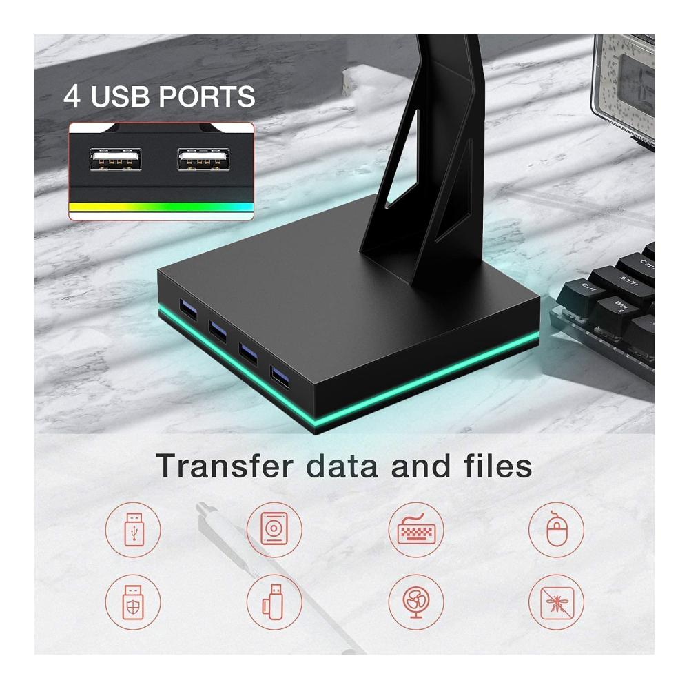 Unser hochwertiger Kopfhörer-Ständer bietet eine solide Basis und ein rutschfestes Design für maximale Stabilität. Der Gaming-Headset-Ständer verfügt über 4 USB 2.0-Anschlüsse und RGB-Beleuchtung, ideal für Gamer und PC-Zubehör. Kompatibel mit einer Vielzahl von Kopfhörermarken, sorgt dieser Ständer dafür, dass Ihre Kopfhörer immer griffbereit sind. Perfekt geeignet für Videokonferenzen, Internetkurse, Live-Übertragungen und mehr. Bestellen Sie jetzt und optimieren Sie Ihren Arbeitsplatz mit Stil und Organisation