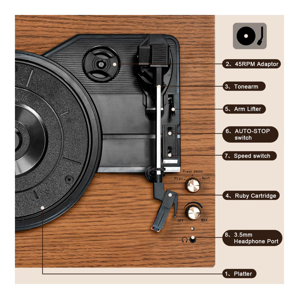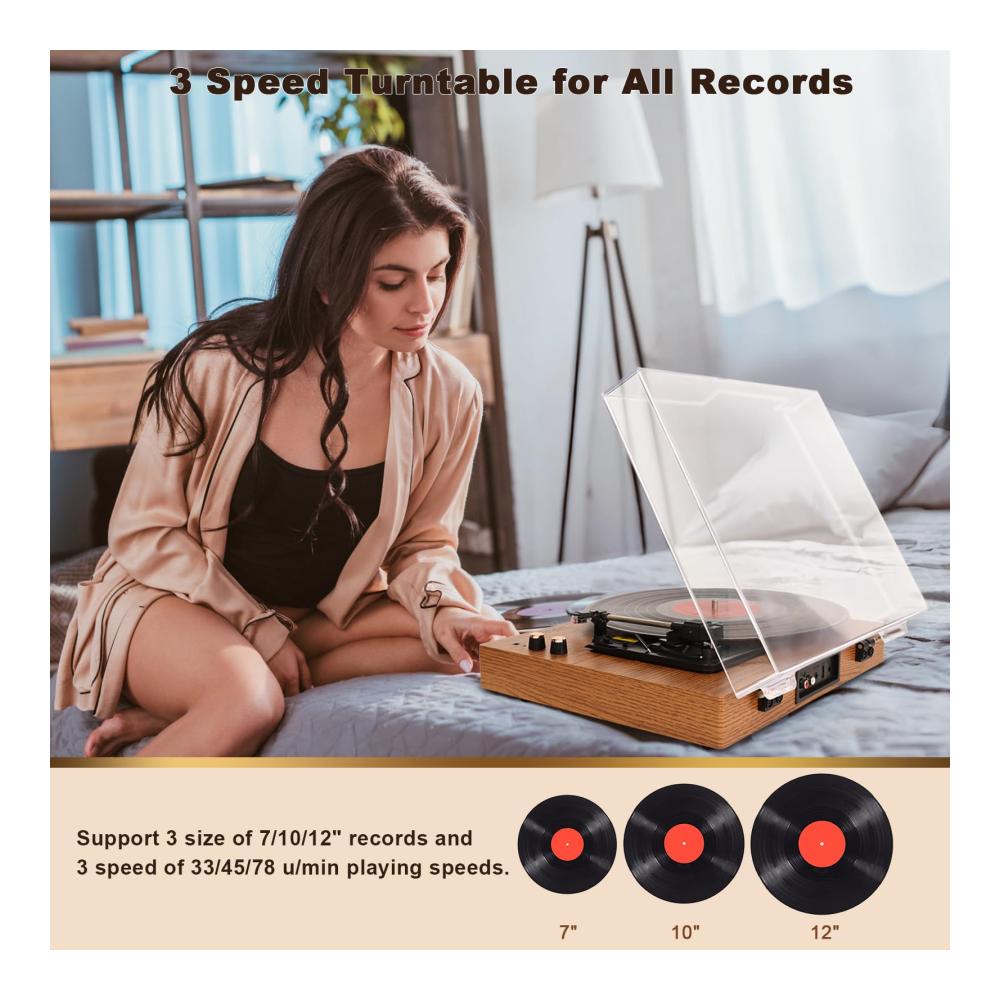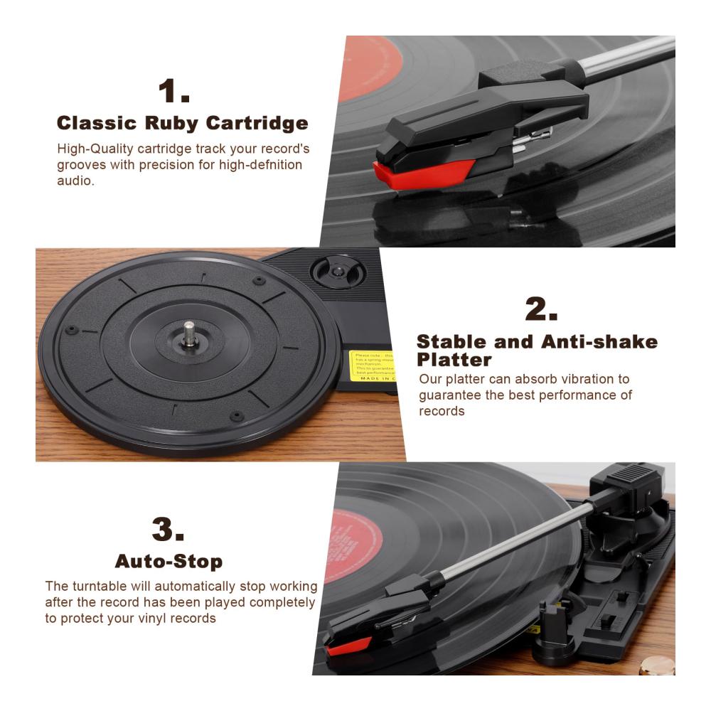 💿【3-Gang-Plattenspieler mit automatischem Stopp】Unterstützt 3 Wiedergabegeschwindigkeiten: 33-1/3, 45, 78 U/min und 7/10/12 Zoll Schallplatten oder Alben. Die Auto-Stopp-Funktion ermöglicht es dem Plattenspieler, sich automatisch zu drehen, nachdem die Schallplatte abgespielt wurde, um die Schallplatte vor übermäßigem Nadelverschleiß zu schützen.