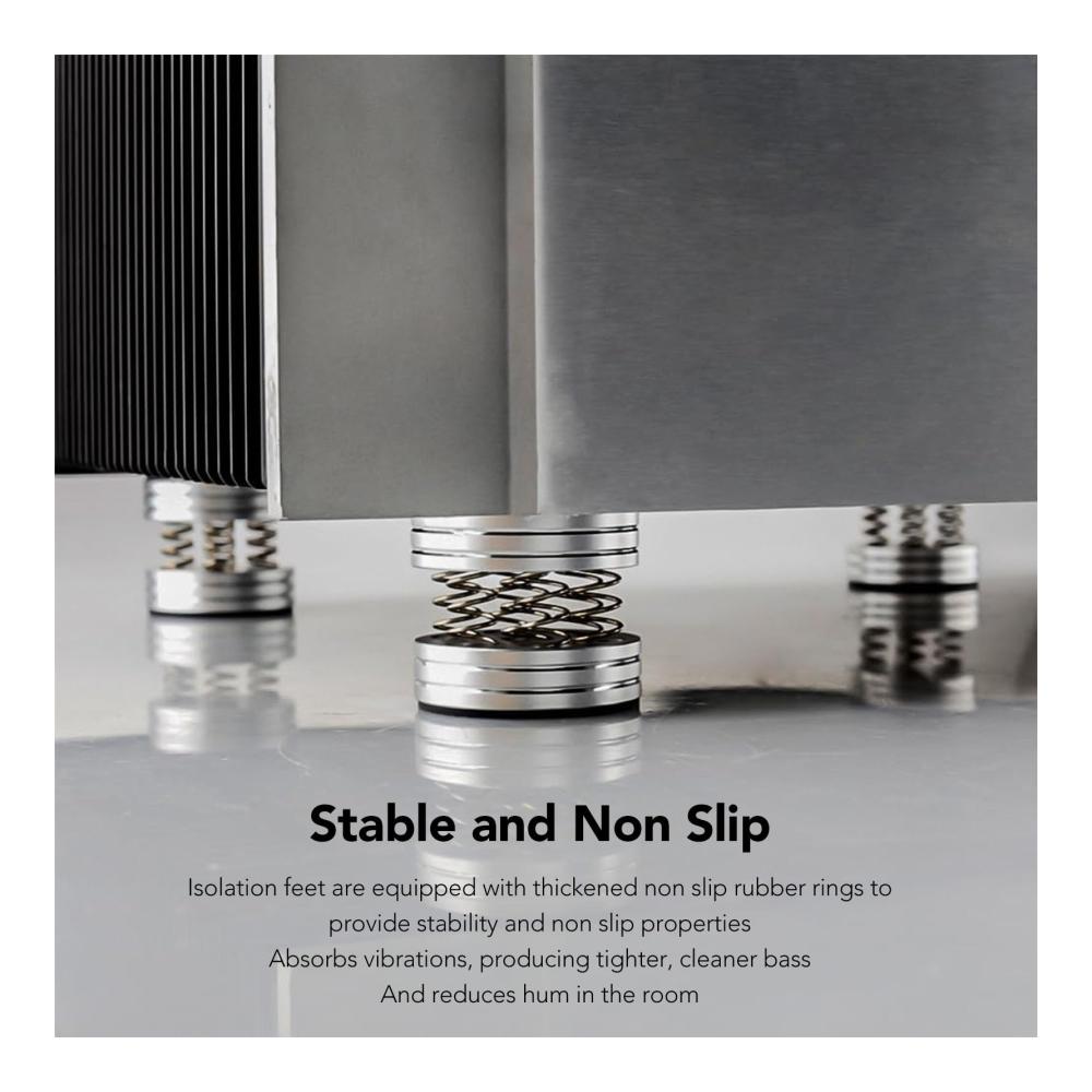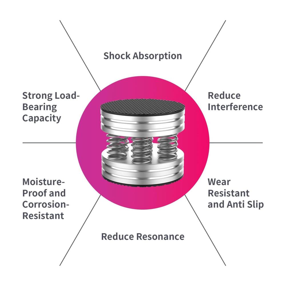 Erleben Sie mit unseren Spikes isolierten HiFi-Lautsprecherständern eine Klangqualität der Extraklasse. Die verdickten rutschfesten Gummiringe bieten Stabilität und verhindern ein Verrutschen, während sie Vibrationen effektiv absorbieren. Schützen Sie Ihren Boden vor Kratzern und genießen Sie straffere, sauberere Bässe ohne störendes Summen. Diese isolierten Standfüße sind perfekt für Lautsprecher, Verstärker, Plattenspieler und mehr. Dank ihres einzigartigen Designs aus Aluminiumlegierung und Edelstahlfeder bieten sie überlegene Stoßdämpfung und Dämpfungswirkung. Keine komplizierten Installationen erforderlich – einfach unter die Lautsprecher platzieren und den verbesserten Klang genießen.