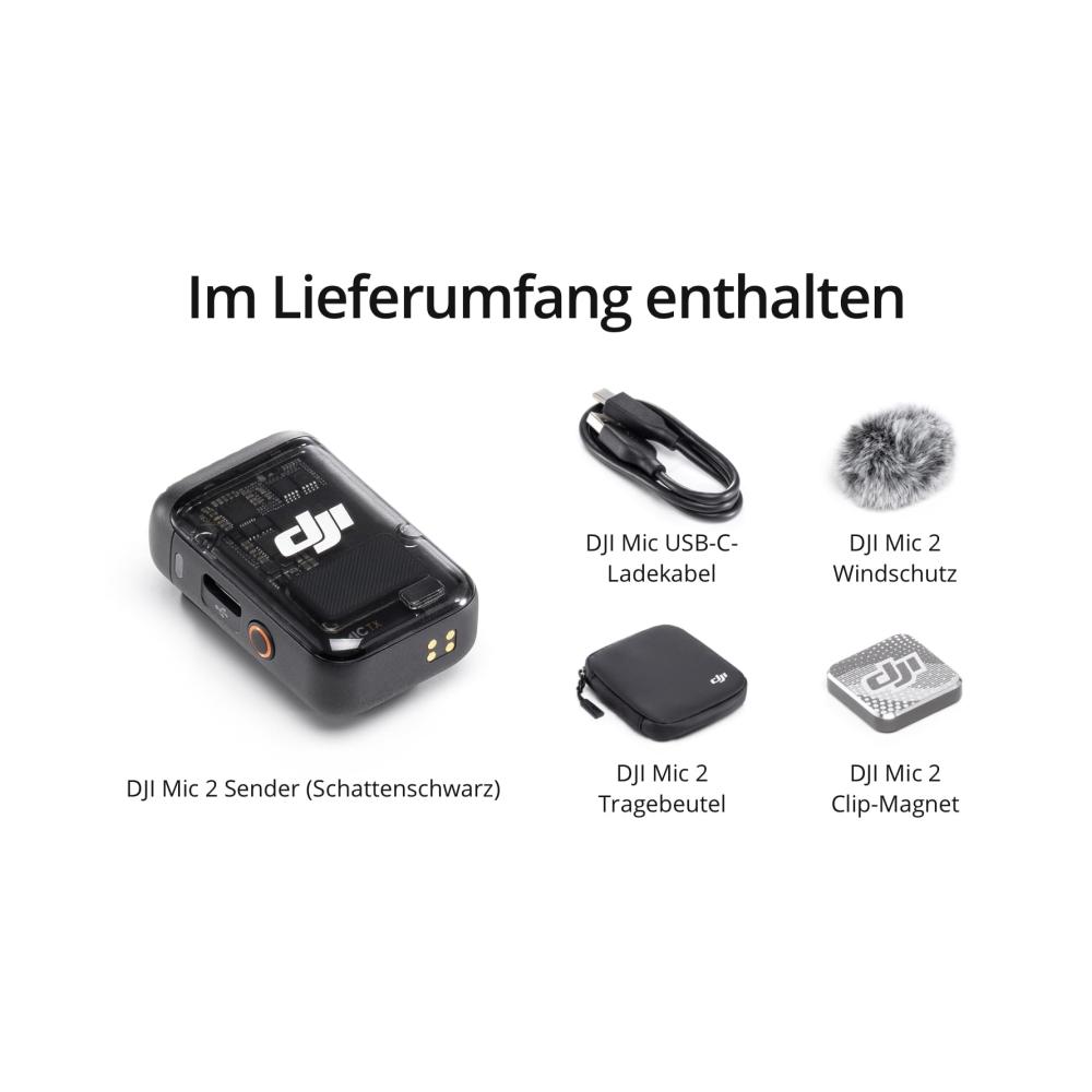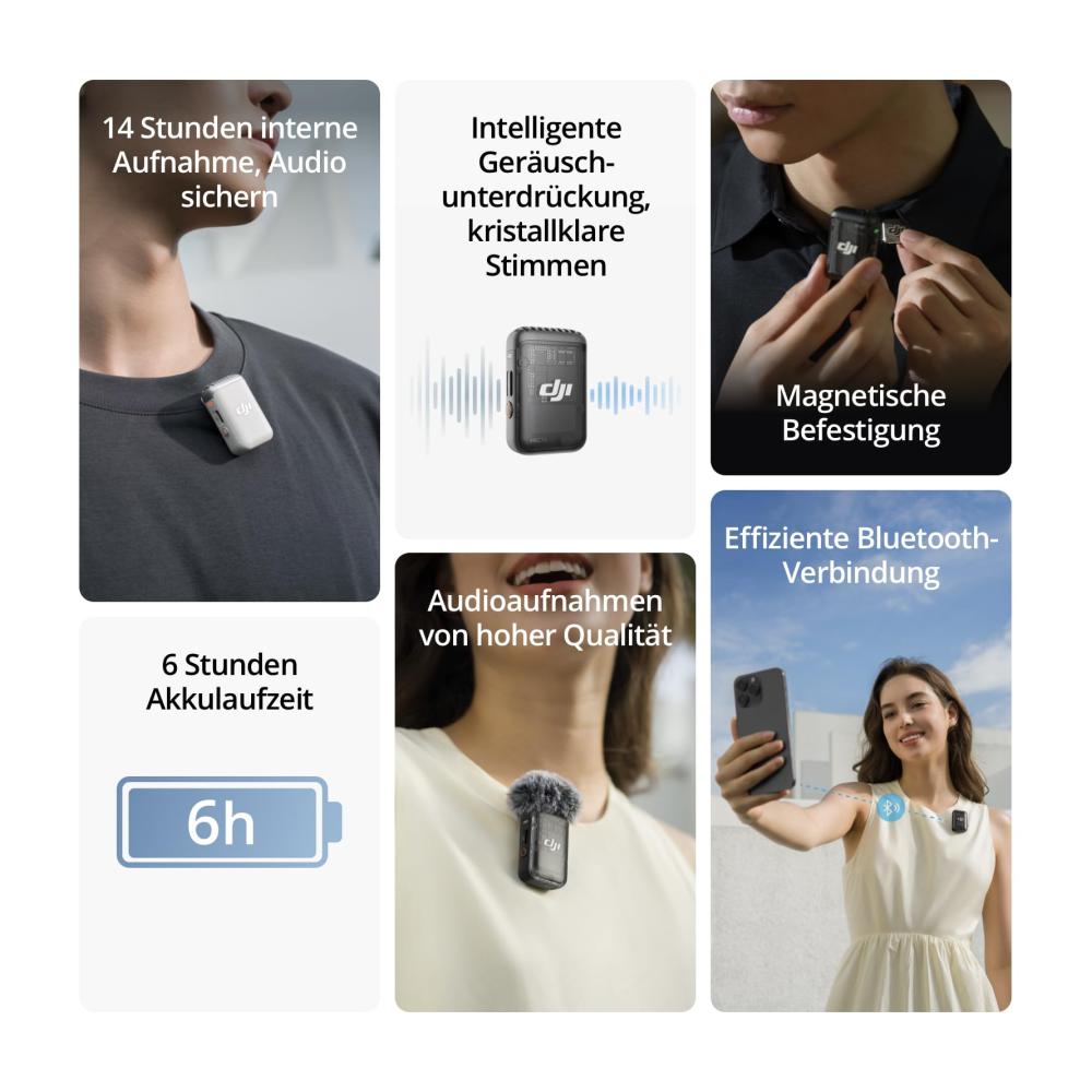 • Dank kristallklarem Audio klingst du wie ein Profi – Dieses kabellose Mikrofon bietet eine hohe Audioqualität mit helleren, klareren und angenehmeren Sprachaufnahmen und ist damit ideal für Interviews, Vlogs und vieles mehr. Weniger Rauschen, bessere Stimmwiedergabe – Die intelligente Geräuschunterdrückung sorgt selbst bei Interviews oder Videoaufnahmen in wechselhaften und unvorhersehbaren Geräuschumgebungen für eine klarere Stimmwiedergabe. Kompakt, magnetisch und diskret – Der kompakte Sender verfügt über ein einzigartiges Clip- und Magnetdesign, das für noch mehr Flexibilität bei der unauffälligen Platzierung sowie professionell wirkende Videos sorgt. Praktische Bluetooth-Verbindung – Der Sender kann einfach per Bluetooth direkt mit einem Smartphone, einer Osmo Pocket 3 oder DJI Action 4 verbunden werden, für effektives Arbeiten. Prüfe vor dem Kauf die Liste der Anpassungsmöglichkeiten für deinen täglichen Gebrauch. Längere Laufzeit, mehr Aufnahmen – Die erweiterte Betriebszeit von 6 Stunden dieses Bluetooth-Mikrofons eröffnet dir umfangreiche Aufnahme- und Livestream-Möglichkeiten, selbst an abgelegenen Orten mit weniger Ladeoptionen. Enthält einen Sender (Schattenschwarz), einen Empfänger uvm. Das transparente schwarze Design des Senders erzeugt einen stilvollen High-Tech-Look. Direkte Verbindung mit Mobiltelefonen, Pocket 3 und Action 4 per Bluetooth. Ideal für Solo-Kameraleute.