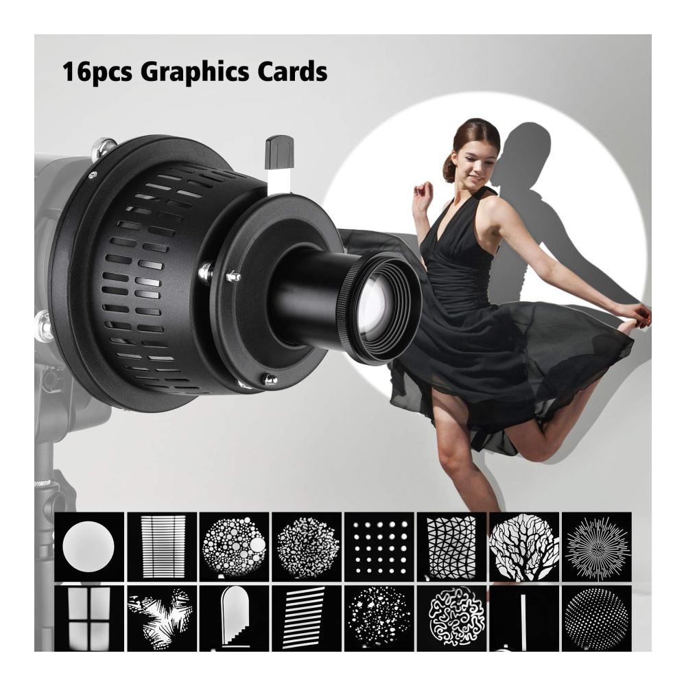 • 16 Grafikkarten: Kommt mit 16 Metall-Grafikkarten, die durch den Kartenschlitz-Adapter in den Schlitz des Snoot gesteckt werden können, um verschiedene Grafik-Lichteffekte zu erzeugen und Ihre Fotos und Videos faszinierender zu machen.