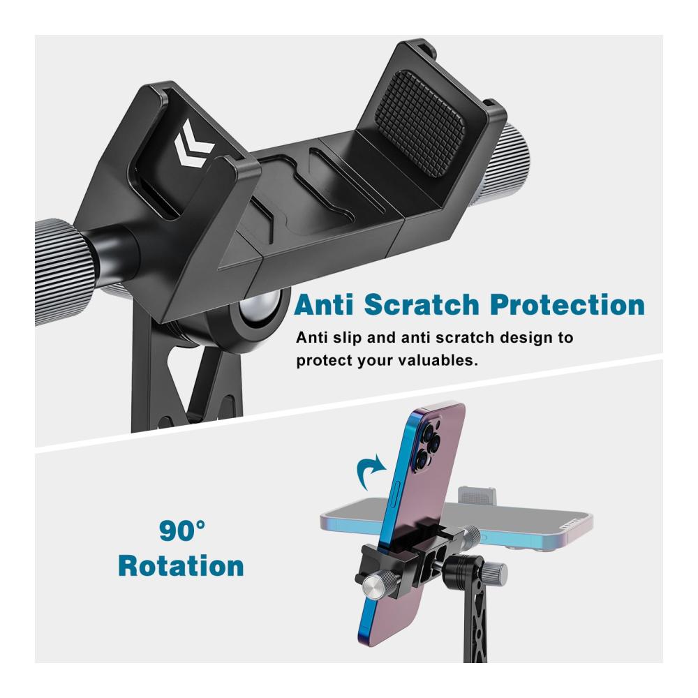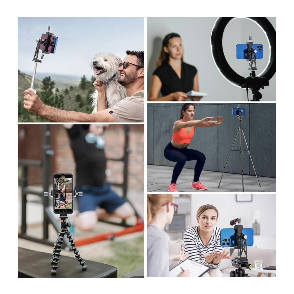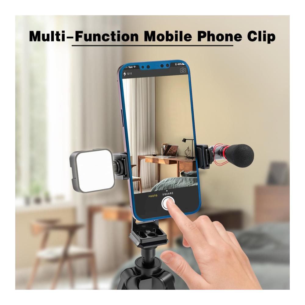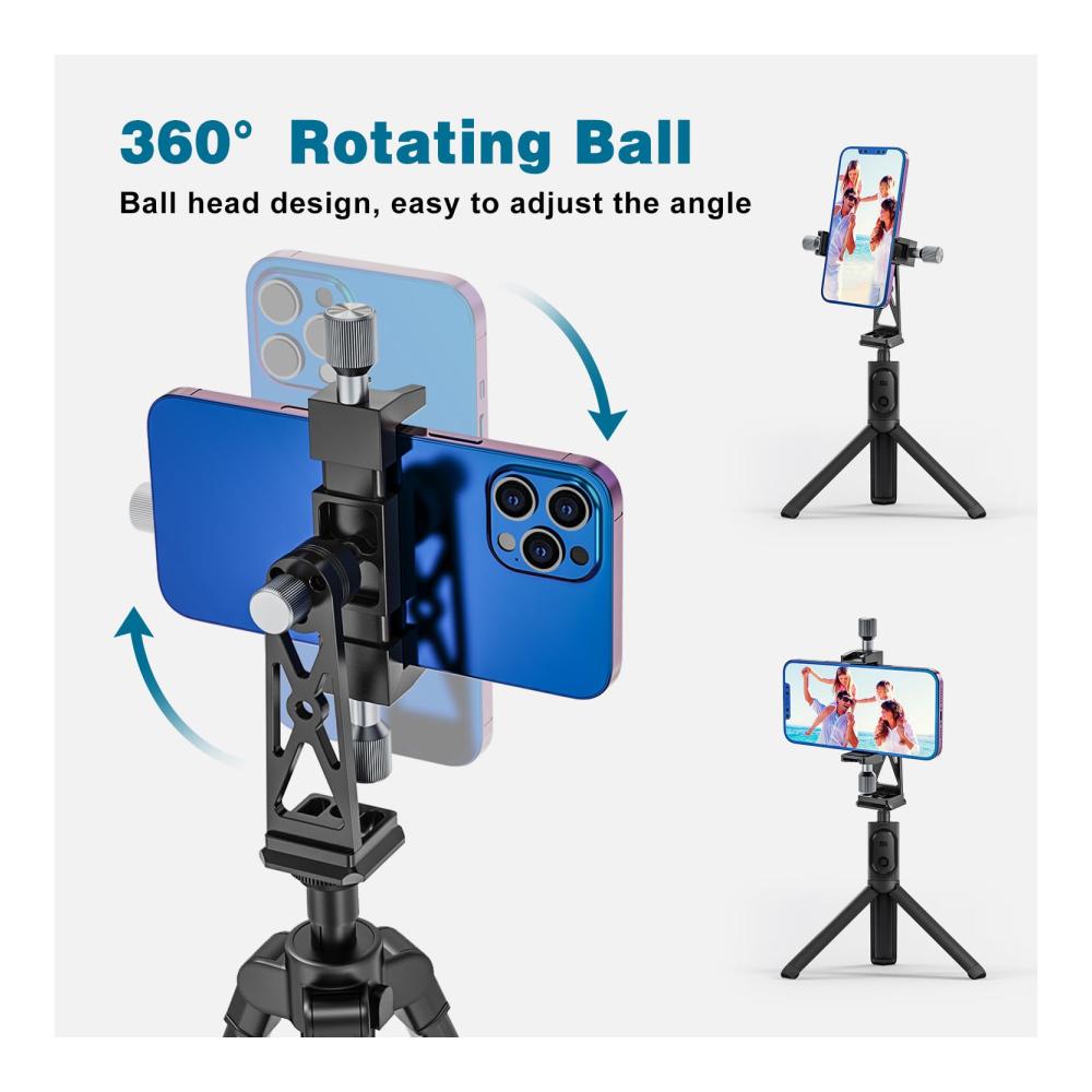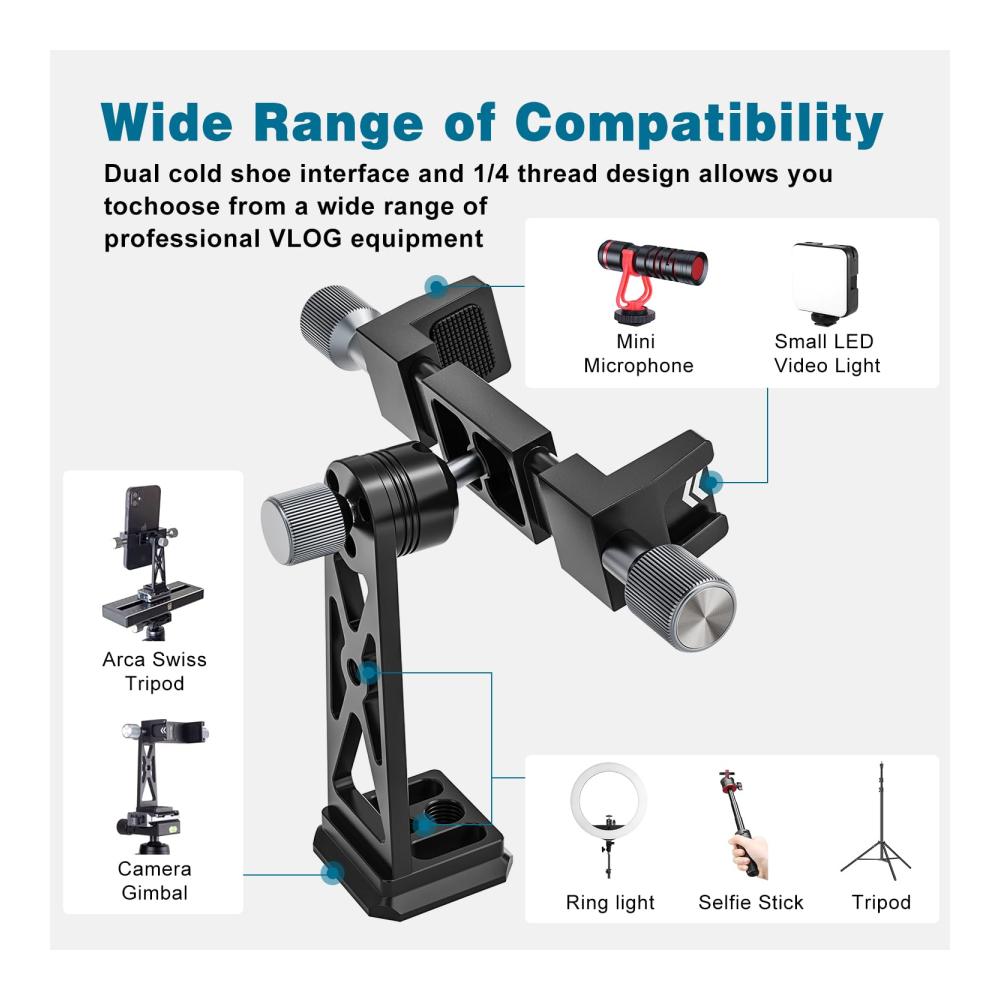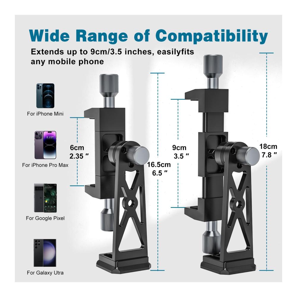 Unser Smartphone Stativ Adapter aus Metall ist in Black erhältlich und bietet maximale Kompatibilität mit einer Vielzahl von Geräten, einschließlich iPhone und Samsung Modelle. Hergestellt aus robustem Eisen, bietet dieser Cliphalter eine stabile Befestigung für Ihr Handy. Die zwei Cold Shoe Halterungen ermöglichen die Anbringung von Zubehör wie Mikrofonen und LED-Leuchten. Dank des 360° drehbaren Designs können Sie mühelos den perfekten Aufnahmewinkel wählen. Holen Sie sich jetzt diesen hochwertigen Smartphone Stativ Adapter für professionelle Aufnahmen!