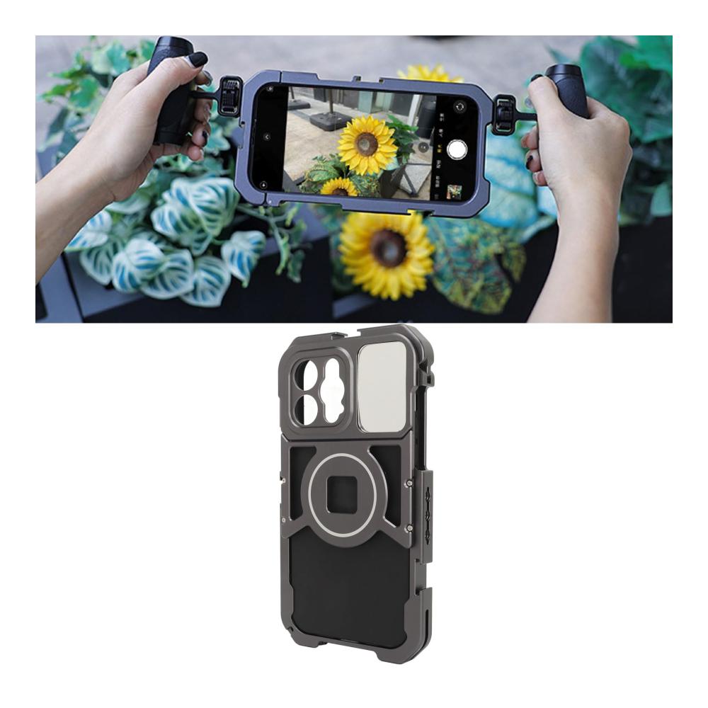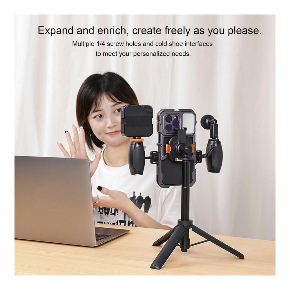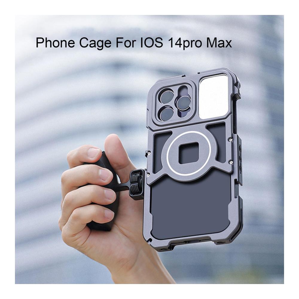 Unser Aluminium-Handykäfig für IOS 14 Pro Max ist speziell entwickelt worden, um Ihren Ansprüchen gerecht zu werden. Der Käfig verfügt über einen CLAW-Schnelltrennanschluss für maximale Kompatibilität mit einer Vielzahl von Zubehör. Mit mehreren 1/4-Zoll-Gewindelöchern und einer Kaltschuhhalterung bietet er Platz für verschiedene Zusatzgeräte wie Fülllichter und Mikrofone. Dank des Klappverschlussmechanismus ist eine schnelle und sichere Installation gewährleistet. Der ultradünne Metallrahmen aus Aluminiumlegierung bietet umfassenden Schutz und professionelle Qualität für Ihre mobile Fotografie. Ein Muss für jeden Outdoor-Videodreh