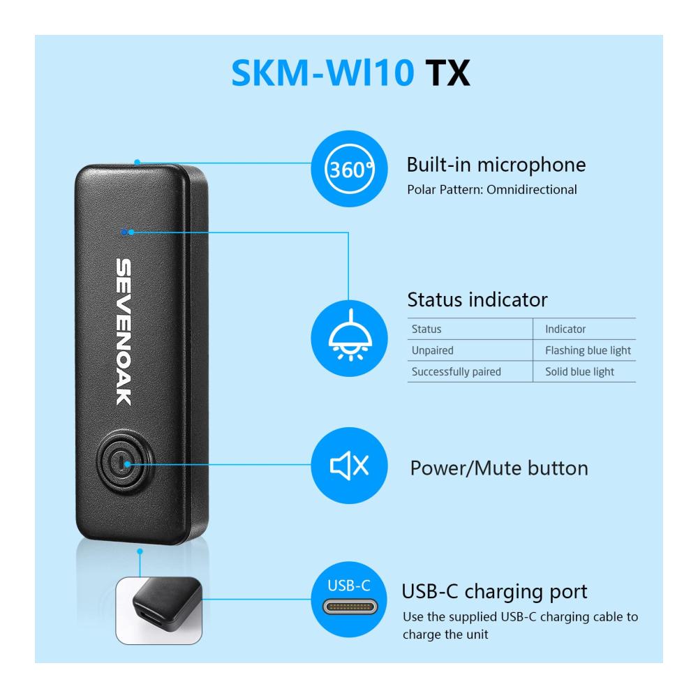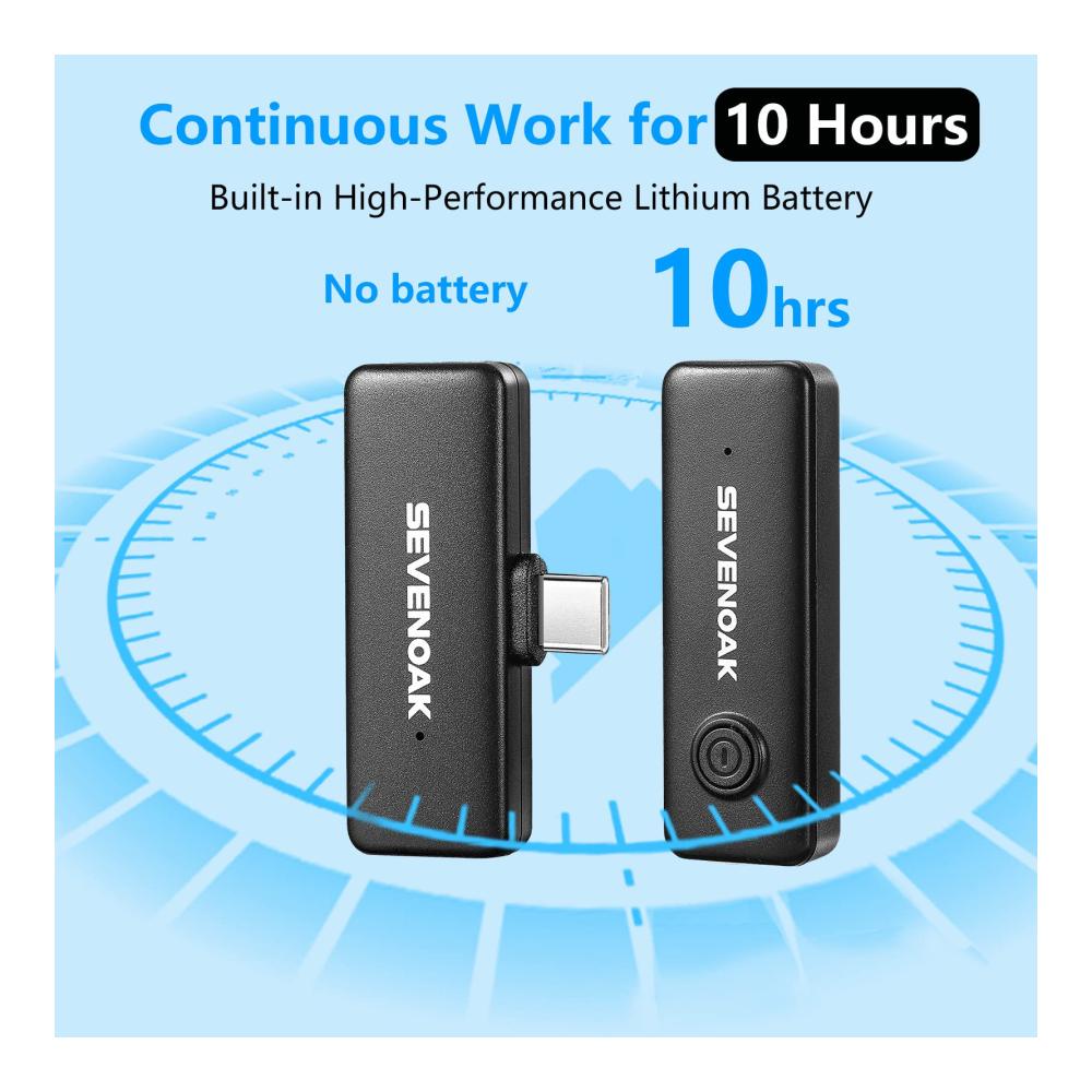 360° Tonaufnahme.SKM-W10 drahtloser Sender, integriertes omnidirektionales Mikrofon, kann Ton aus verschiedenen Bereichen von 360 Grad aufnehmen. Doppelklicken Sie einfach auf die Taste, um die Abschaltung einzuschalten, und das Mikrofon kann die menschliche Stimme genau erfassen und die Störungen von Umgebungsgeräuschen reduzieren. | Kompatibel mit USB-C-Adapter.Das SKM-W10-Mikrofon ist weithin kompatibel mit Samsung/LG/Pixel/USB-C Tablet/USB-C Port-Geräten. Perfekt für Youtube, Vlogging, Podcasting, Facebook-Videoaufnahmen, Live-Streaming, Interviews, Präsentationen, Kirchen, Hochzeiten usw. | 10 Stunden Betriebszeit.Der drahtlose Sender verfügt über eine eingebaute wiederaufladbare Lithium-Batterie, die mehr als 10 Stunden halten kann. Der Empfänger muss nicht aufgeladen werden, er kann durch Einstecken in das Handy verwendet werden, Plug and Play. |
