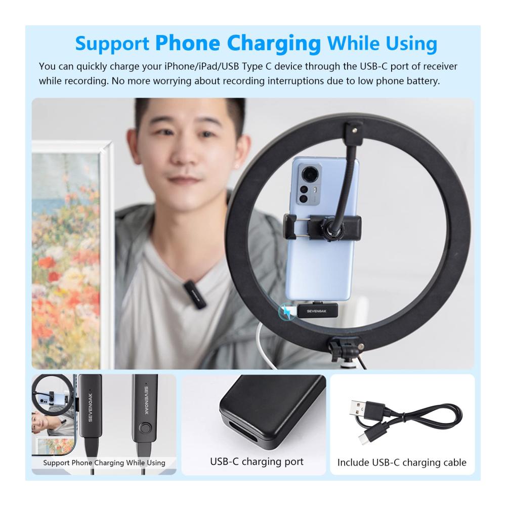 ▶【Fast Charge Your Phone】The receiver of wireless lavalier microphones features a USB-C port, allowing you to charge your phone while recording by connecting the included USB-C cable. It supports QC/PD fast charging protocol, and supports up to 3A fast charging speed, allowing the mobile phone to be used while charging to avoid live broadcast interruption. Great for live streaming/online meeting/recording/Vlog etc.