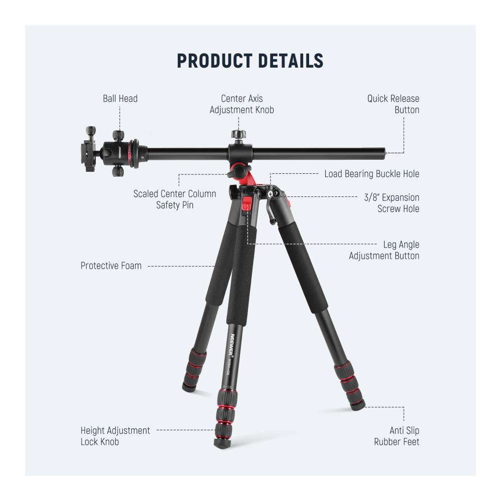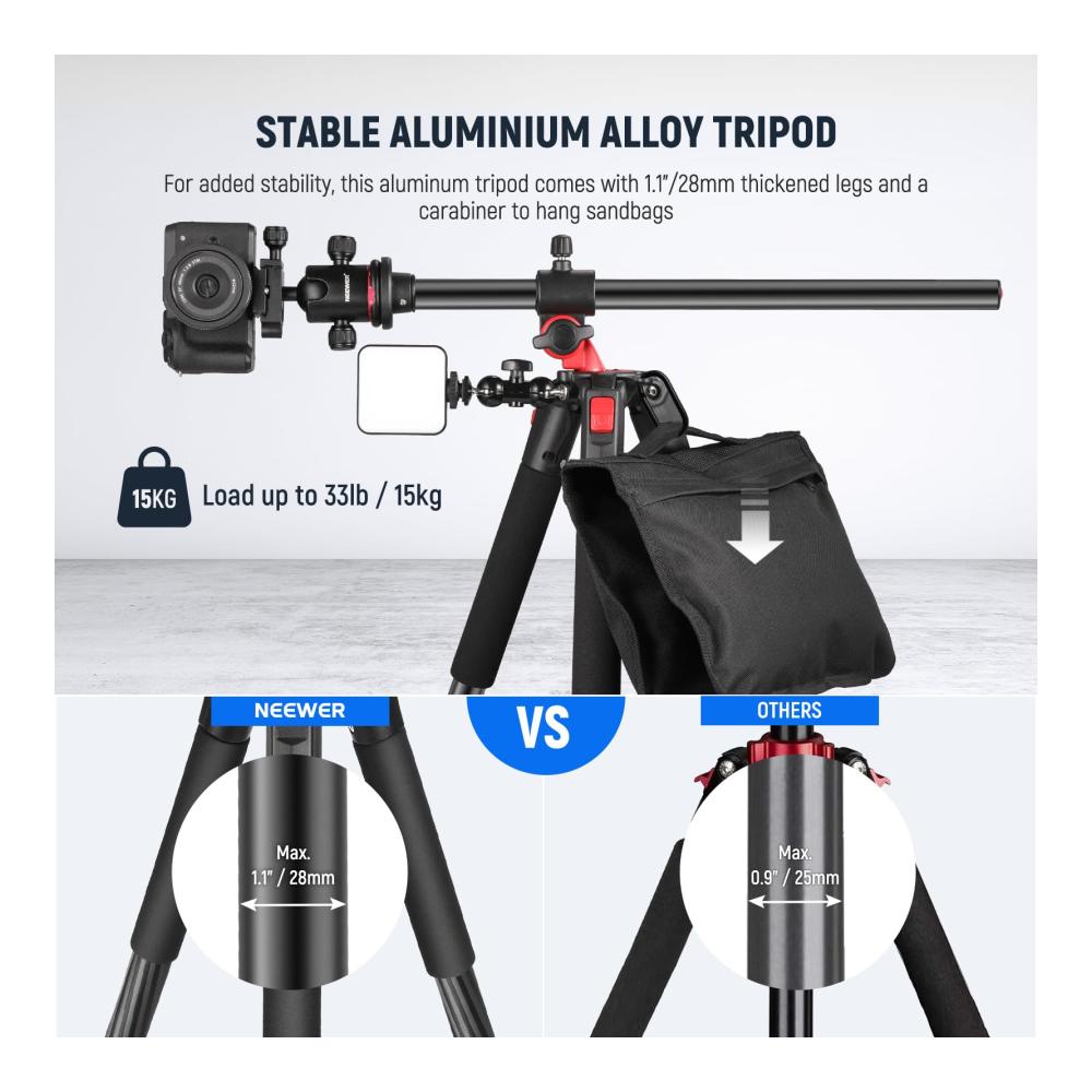 Stabiles Stativ: Das aus einer Aluminiumlegierung gefertigte Stativ mit einem maximalen Rohrdurchmesser von 1,1&34;/28mm ist stabil genug, um Ihre Kameraausrüstung bis zu 33lb/15kg zu tragen. Im Lieferumfang ist ein Karabiner enthalten, an dem ein Sandsack oder andere schwere Gegenstände aufgehängt werden können, um die Stabilität zu erhöhen, falls erforderlich