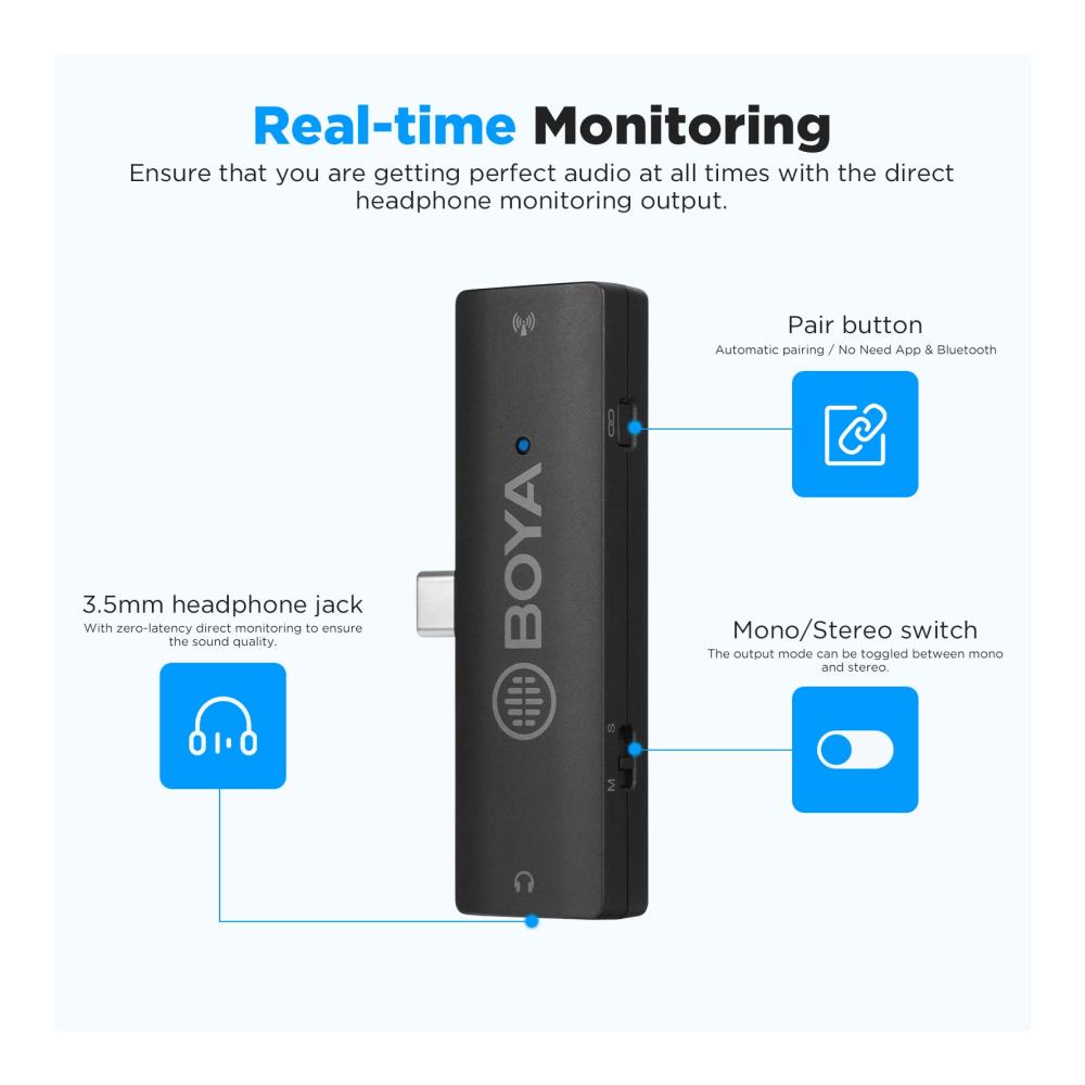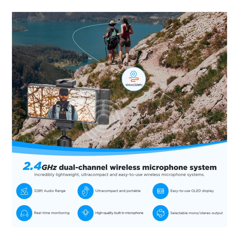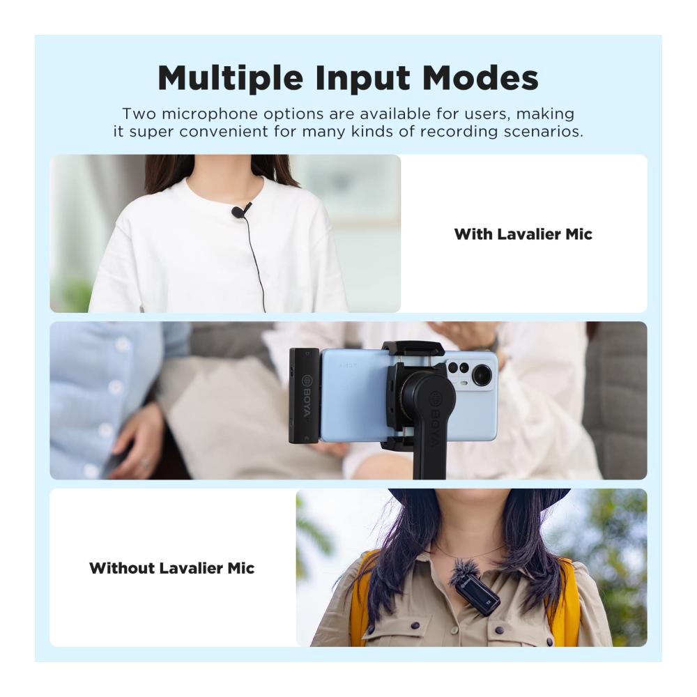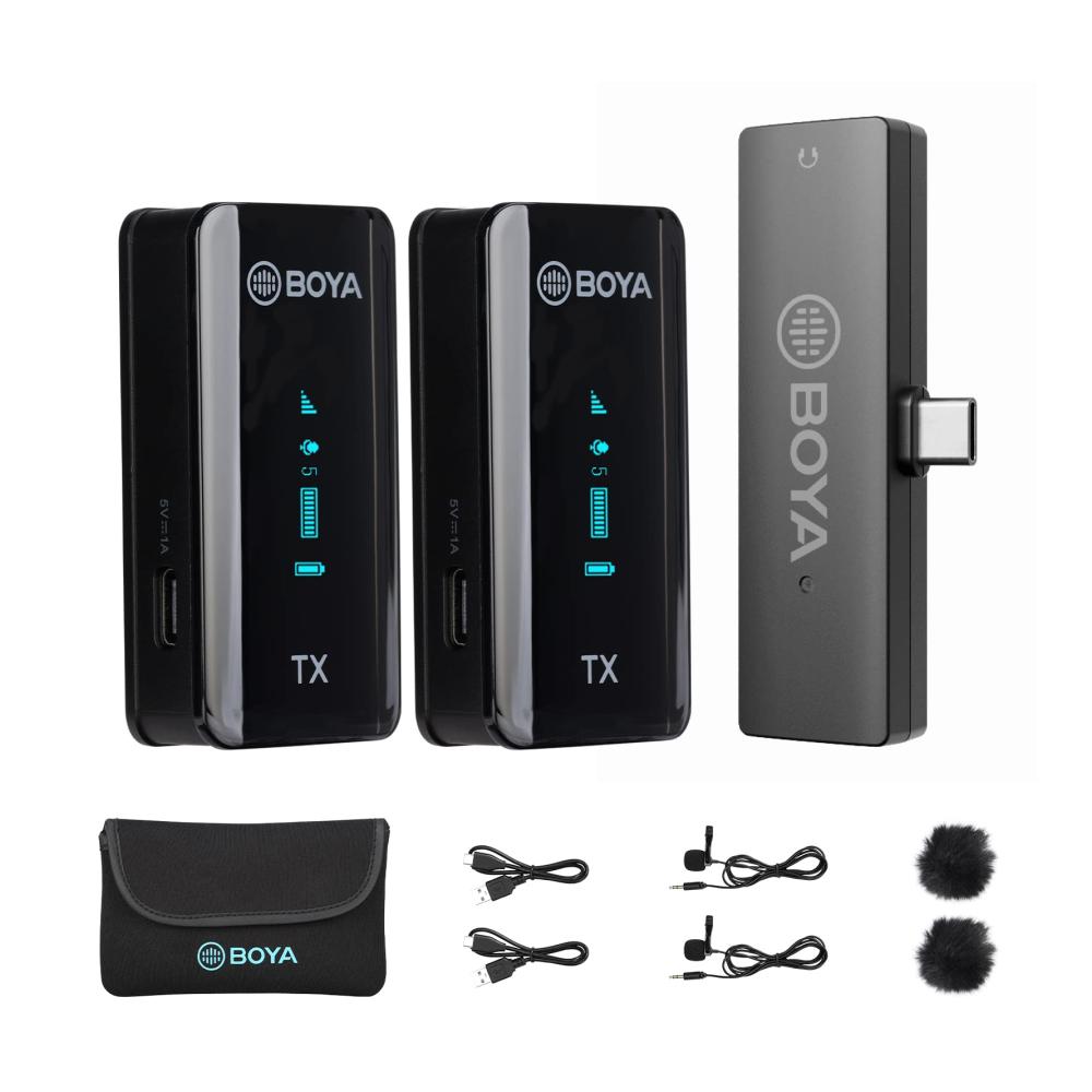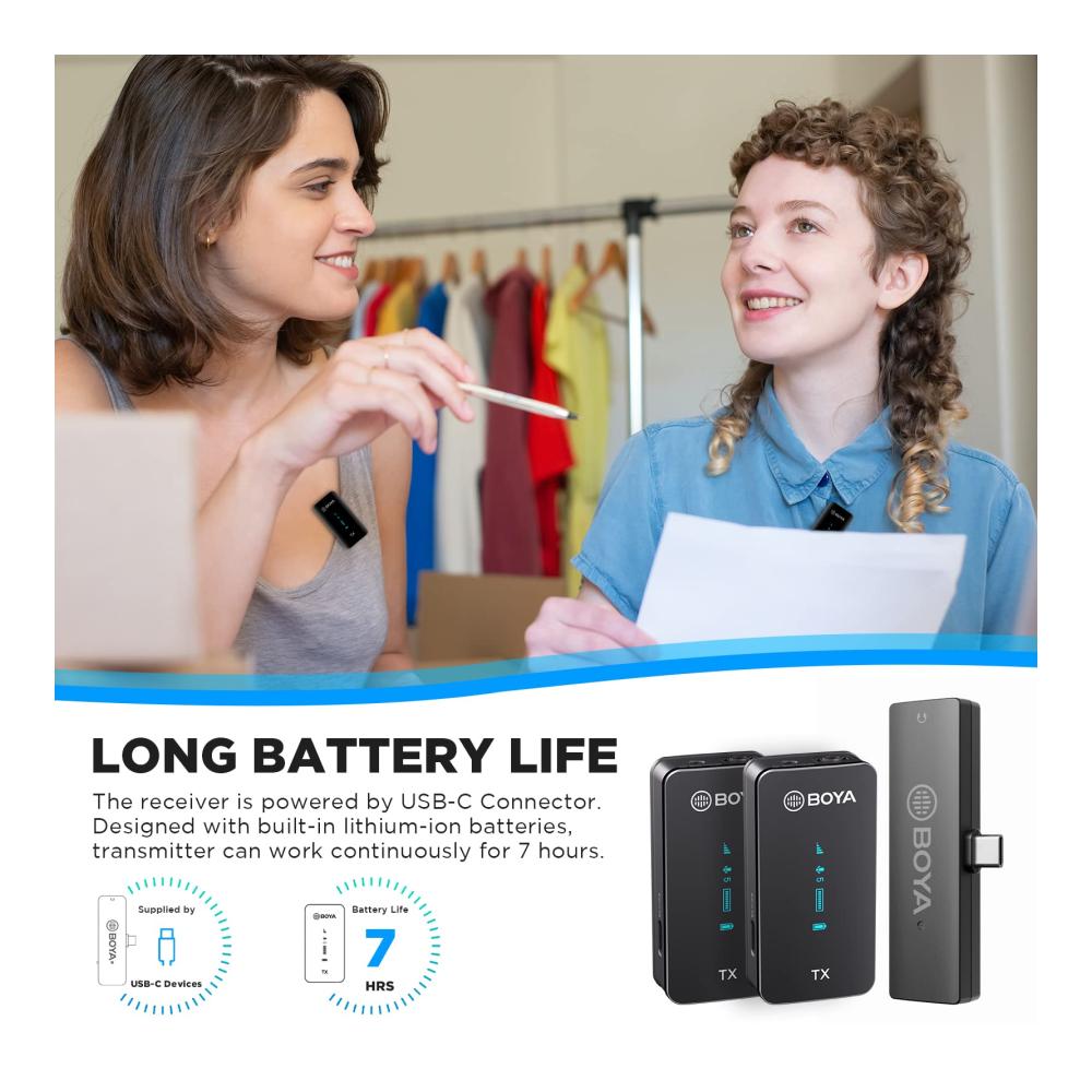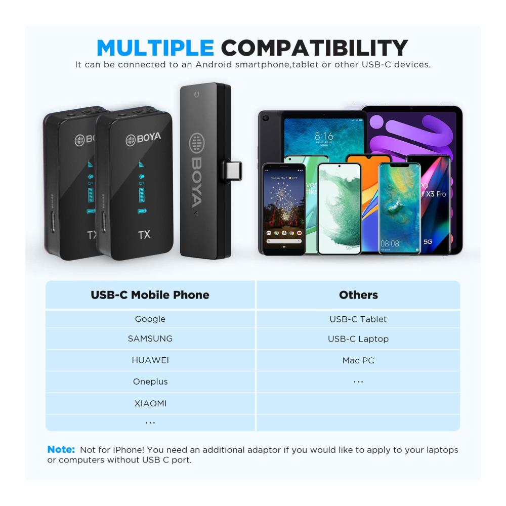 BOYA BY-XM6 Wireless Lavalier Microphone for Video Recording YouTube Facebook Live Stream Podcast Interview Vlog BOYA BY-XM6 S6 is a 2.4GHz adaptive frequency hopping wireless lapel microphone system, consists of 2 transmitters and a USB Type-C receiver. Designed for USB Type-C Android Phone Tablet Laptop. Prefect for YouTube/Facebook Live Stream, TikTok Creators, and other video recording lovers. Specification of BOYA Wireless Microphone BY-XM6 TX Transmitter Transmission Type: 2.4GHz Digital Frequency Operating Range: Up to 328ft (100m) (without obstacle) RF Output Power: <10mW Polar Pattern: Omnidirectional Frequency Response: 35Hz-18KHz Maximum SPL: Built-in Microphone: 120dB SPL; Lavalier Microphone: 110dB SPL Sensitivity: Built-in Microphone: -39dB; Lavalier Microphone: -39dB SNR: > 84dB Power Requirements: Built-in Li-ion Battery or USB-C DC 5V or Charging Contact Built-in Battery Life: Approx. 7 hours Antenna PIFA Antenna Audio Inputs: 3.5mm TRS MIC/LINE IN Jack or Built-in Microphone Weight: Approx. 32g (1.13oz) Dimensions: 62.1×31.6×16.5mm Specification of BOYA Wireless Microphone BY-XM6 RXU USB Type-C Receiver output connector:3.5mm headphone jack, lightning connector Power Requirement: Supplied by USB-C devices Weight: Approx. 14.5g (0.51oz) Dimensions: 75.6×23×12mm
