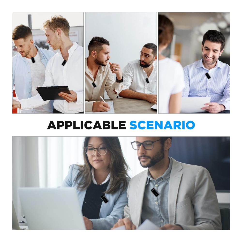 Eingebautes Mikrofon und externes Mikrofon: Jeder Sender ist mit einem Lav-Mikrofon ausgestattet und verfügt über ein eingebautes omnidirektionales Mikrofon. Der Benutzer kann den Sender am Halsband befestigen, um Geräusche aufzunehmen, oder ein Lavalier-Mikrofon in die MIC IN-Buchse des Senders einstecken, um Ton aufzunehmen. Das externe Ansteckmikrofon ist im Paket enthalten.