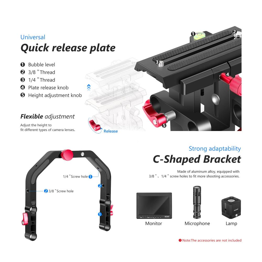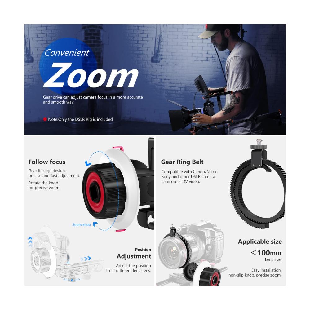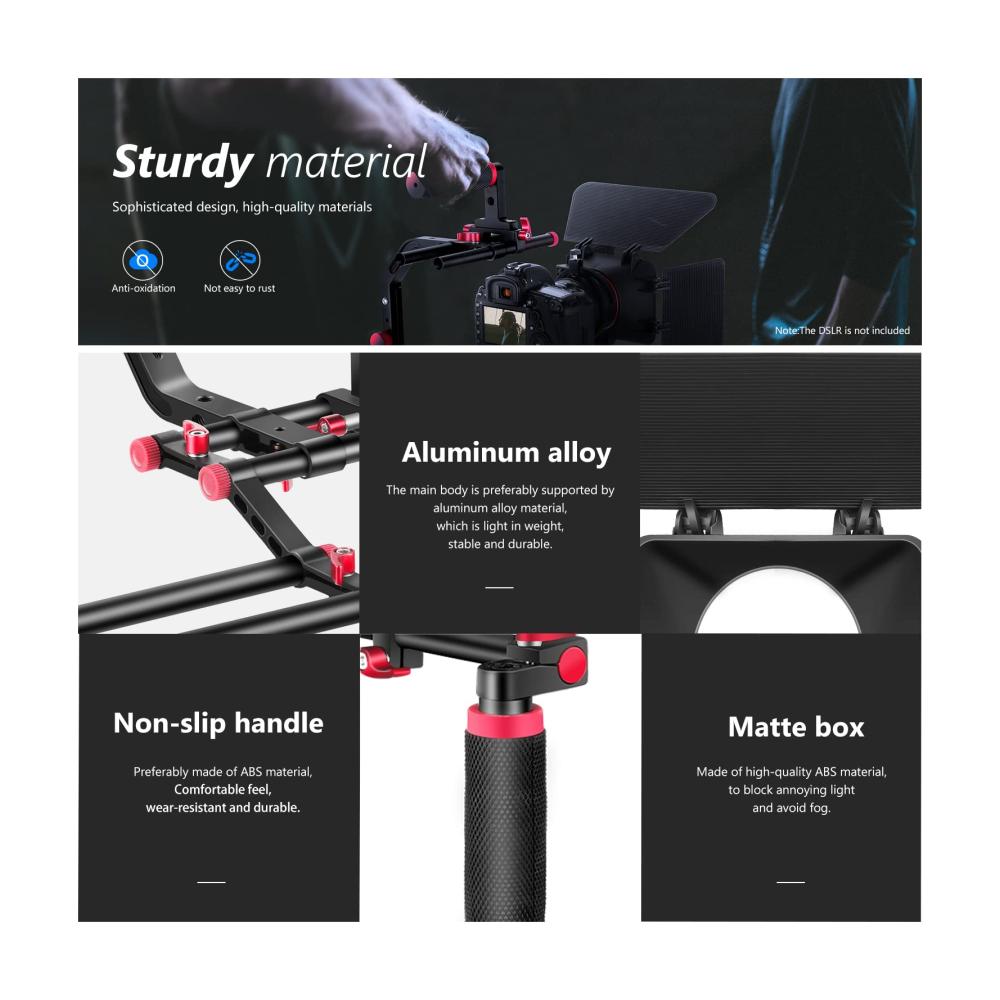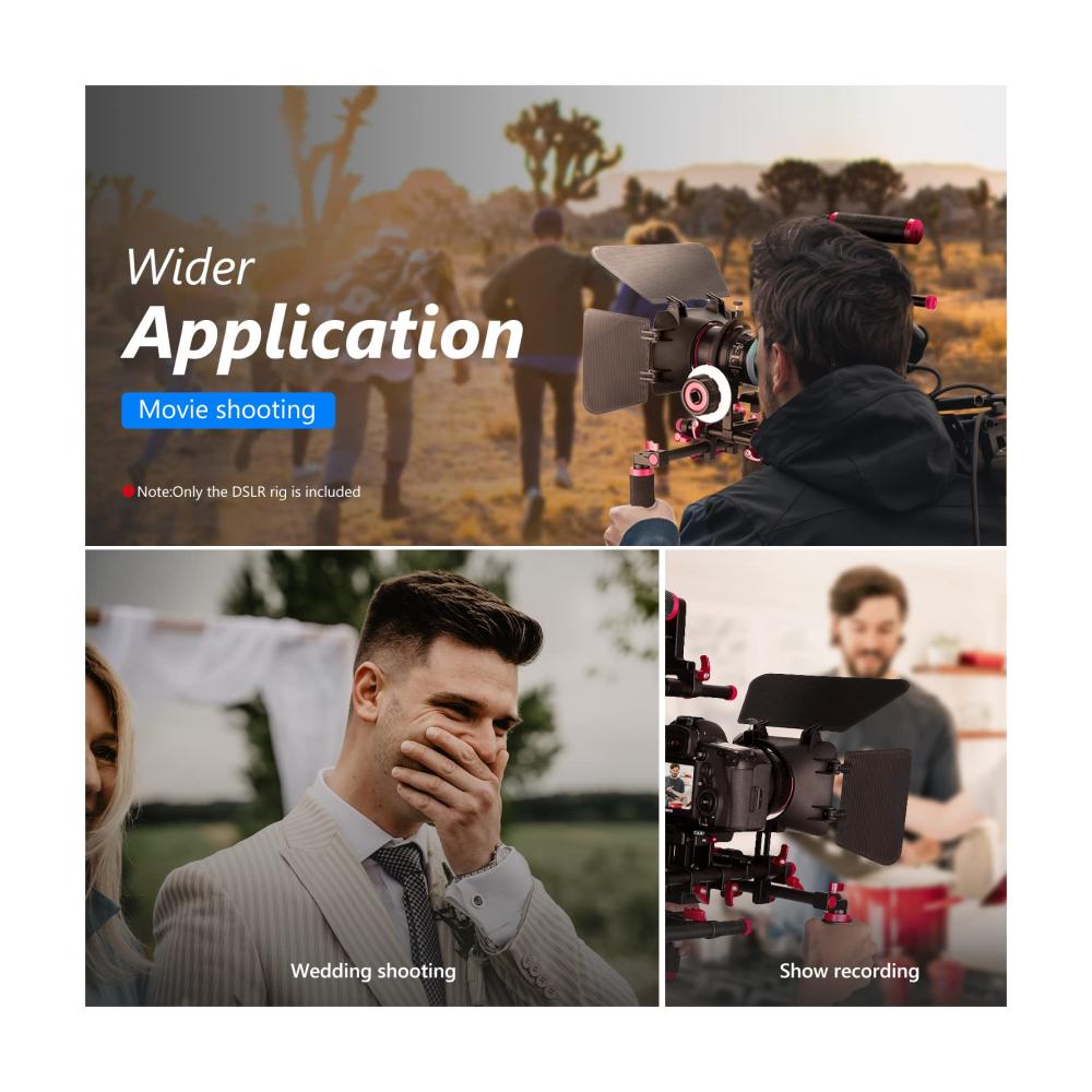 15mm StangensystemDurchmesser der Stange: 15mm, Abstand der Mitte: 60mm. Die Stange aus Aluminiumlegierung ist abriebfest und ätzfest. | C förmige HalterungSolide Aluminiumlegierung; kann auf beide Arten nach Ihren persönlichen Vorlieben montiert werden; ein rutschfester Gummigriff gibt Ihnen einen festen und komfortablen Griff. | Fokus folgenGetriebe kann den Kamerafokus genauer und reibungsloser einstellen. Zahnrad Gürtel ist geeignet für Objektive mit einem Durchmesser von weniger als 100mm. | Matte BoxDie Flaggen sorgen für zusätzliche Flare Reduzierung und verbessern die Qualität der Videos. Passend für Objektive von 43mm bis 77mm (nicht für andere geeignet). |