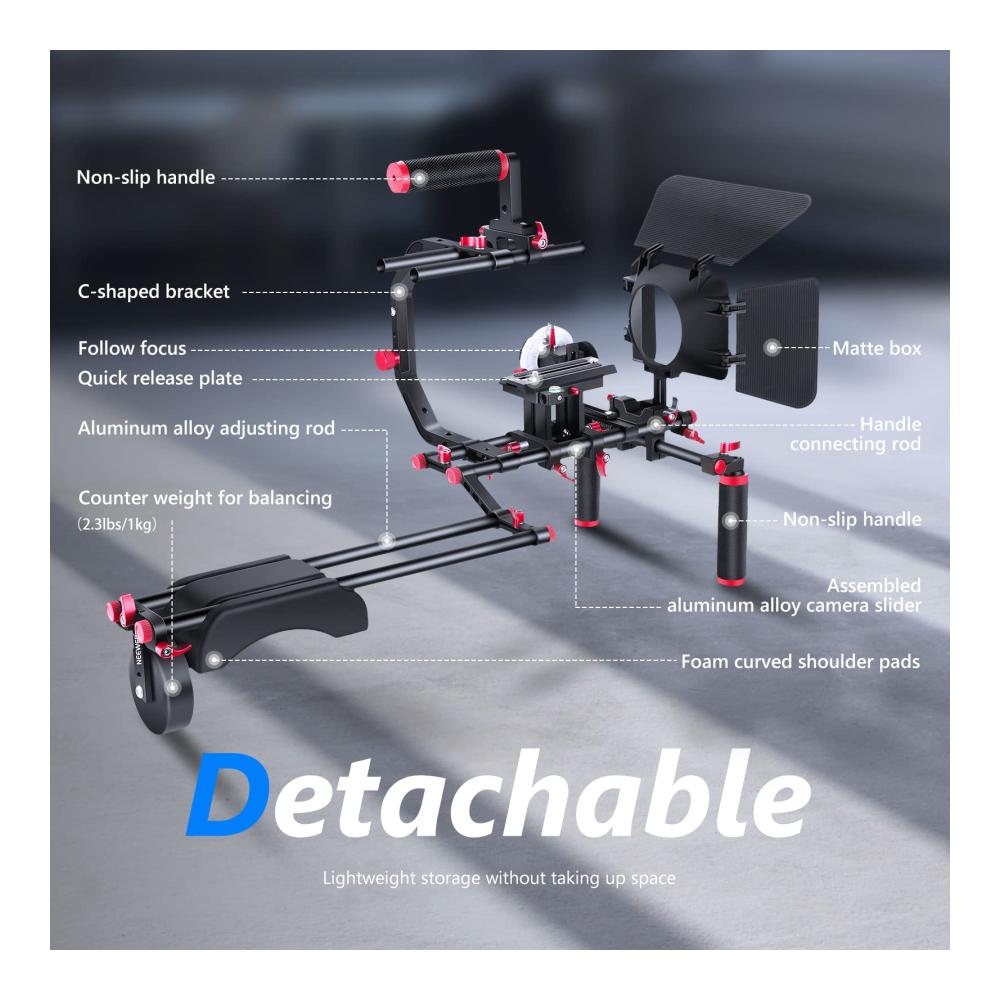 Die C-förmige Halterung bietet eine erhöhte Portabilität und das 1,1 Kilogramm Gegengewicht sorgt für eine ausgewogene Schultermontage. Die Matte Box ist in der Höhe verstellbar und kompatibel mit Standard 15mm Schienen. Der Follow Focus ermöglicht präzise und wiederholbare Fokussierung, während der Schulterkäfig eine stabile Plattform für Ihre Kamera bietet.