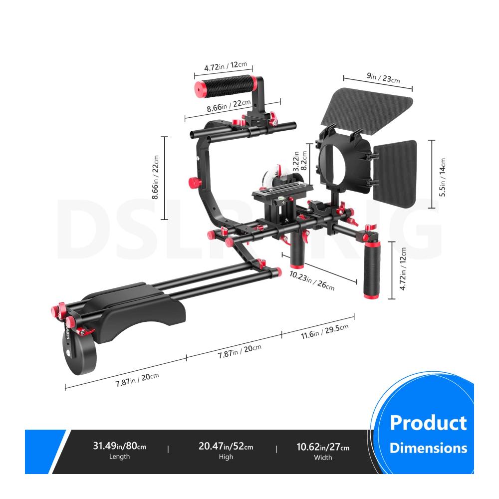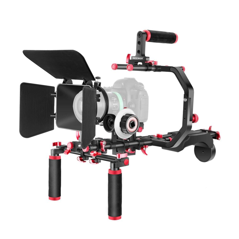 Erleben Sie mit dem Neewer Schulter Rig Kit für DSLR Kameras und Camcorder ein professionelles Film- und Videoerstellungssystem, das Ihre Aufnahmen auf ein neues Niveau hebt. Unser umfassendes Kit enthält eine C-förmige Halterung mit Handheld Griff, 15mm Stangen, eine Matte Box, einen Follow Focus und einen Schulterkäfig mit weichem Gummi-Schulterpolster und Dual-Handgriffen.
