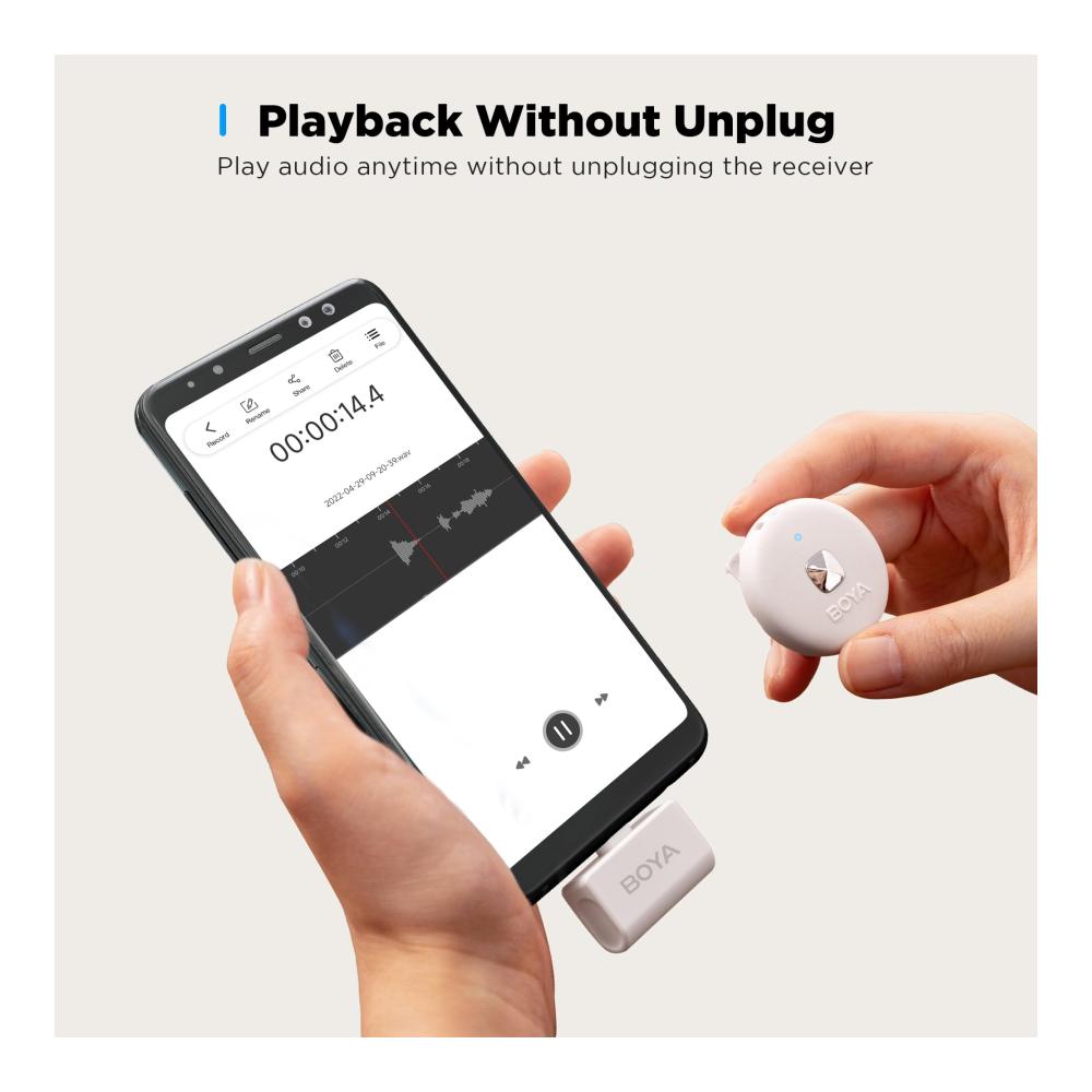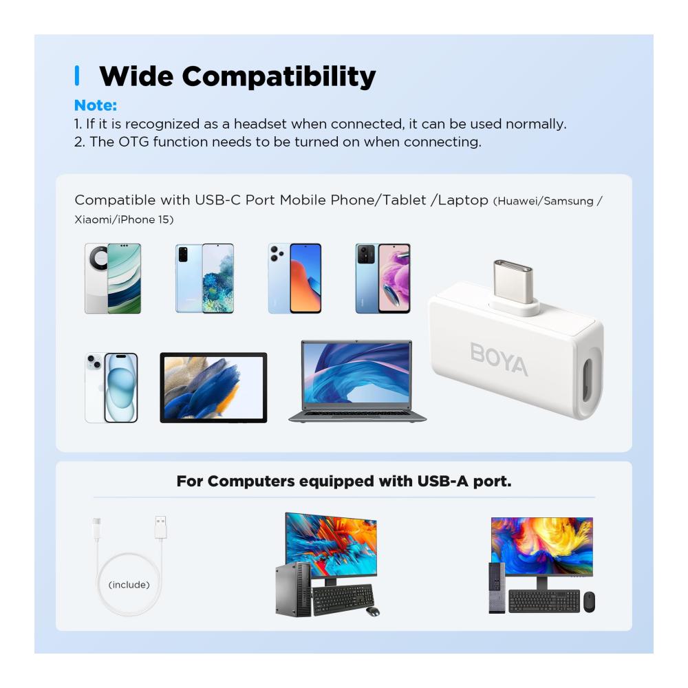 【Einfache automatische Verbindung】Das BOYA Omic-U Mikrofon benötigt keinen Treiber. Schließen Sie den Empfänger einfach an Ihr Aufnahmegerät an, schalten Sie den Empfänger ein, und er wird automatisch für die Verwendung gekoppelt. Hinweis: Vergewissern Sie sich, dass Sie die OTG-Funktion in den Einstellungen Ihres Geräts aktiviert haben.