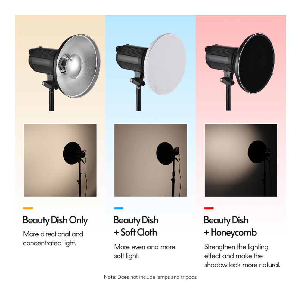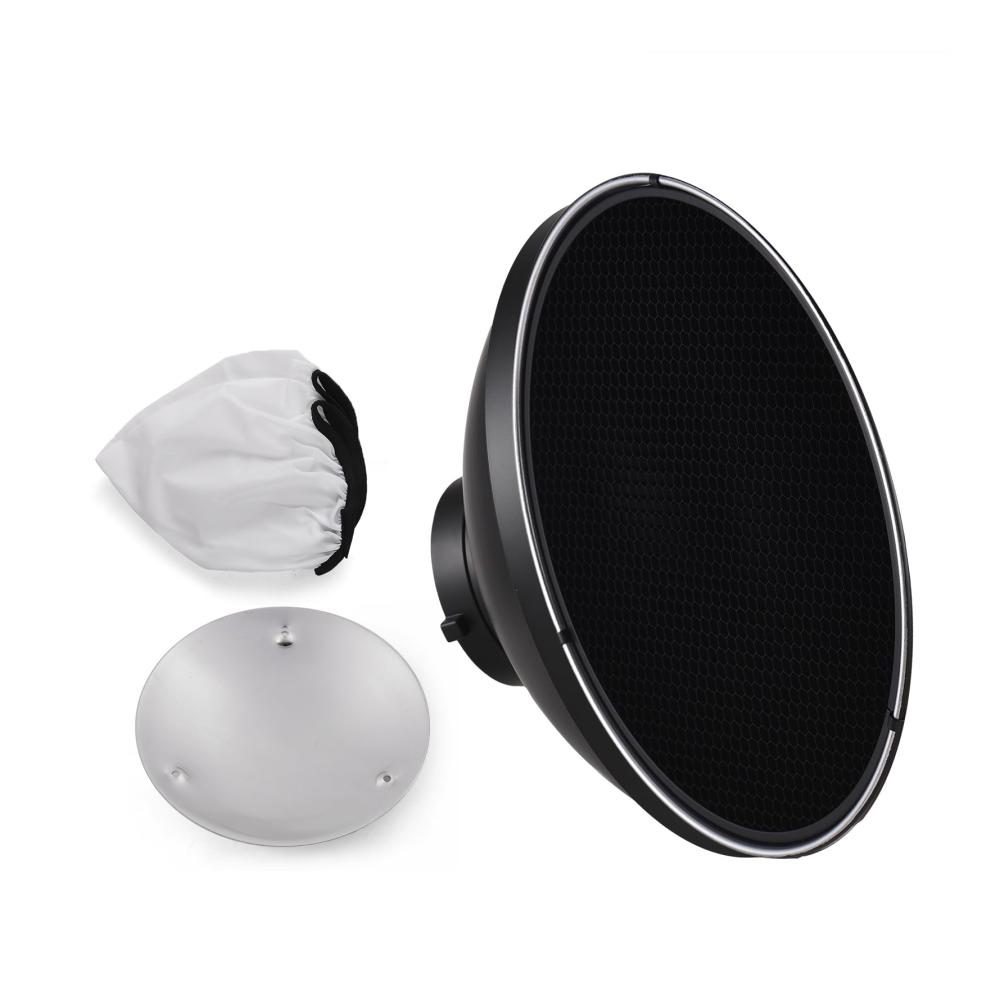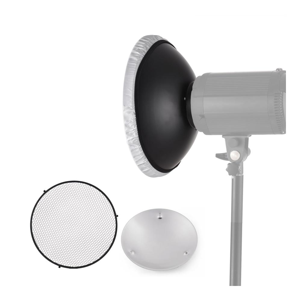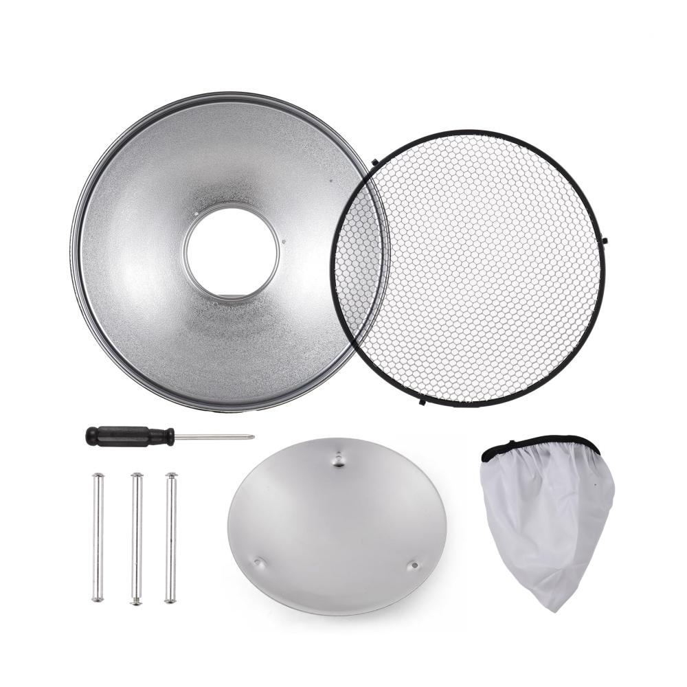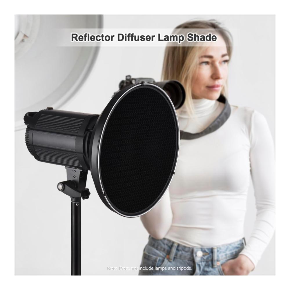 Unser 30 cm/11 8 Zoll Standardreflektor Beauty Dish Bowens-Halterung bietet vielseitige Möglichkeiten für Studio-Porträtfotografie und Stroboskop-Blitzlichtaufnahmen. Der aus Aluminium strukturierte Standardreflektor mit einem Durchmesser von ca. 30 cm ist ideal für verschiedene Lichteffekte. Die universelle Bowens-Halterung ermöglicht eine schnelle Montage von Taschenlampen und Studio-LED-Leuchten. Das mitgelieferte Diffusortuch und Wabengitter bieten flexible Lichtsteuerung und erfüllen verschiedene Anforderungen. Dieser Reflektor ist perfekt für Porträt- und Studiofotografie sowie Videoaufnahmen geeignet und sorgt für weichere Lichteffekte. Die mittlere Reflektorplatte sorgt für gleichmäßigere Beleuchtung und eignet sich für verschiedene Porträtprofile.