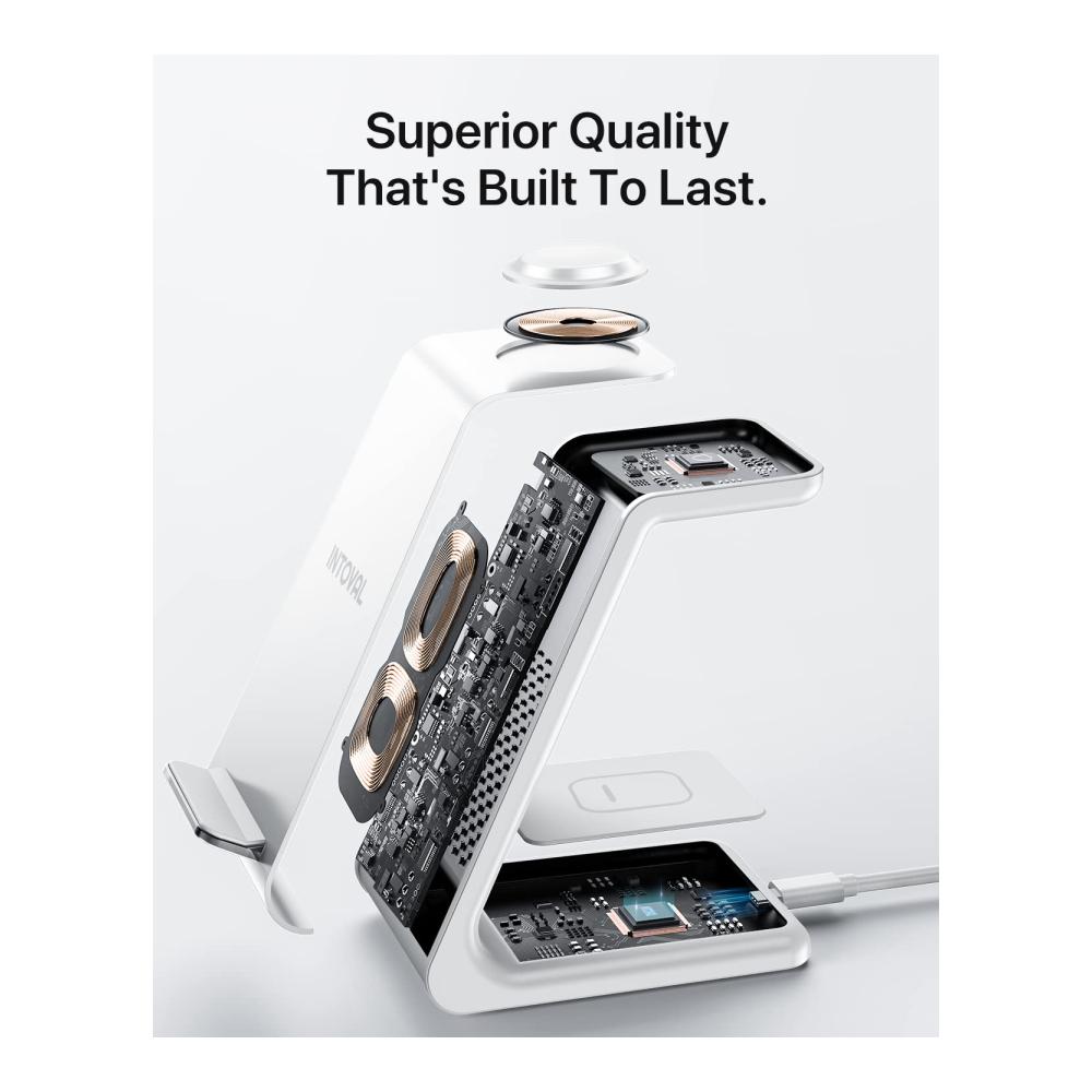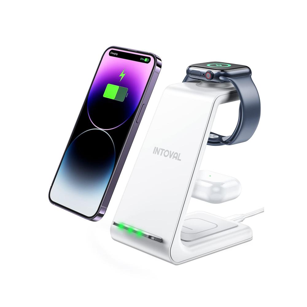 Ein Gerät zum drahtlosen Aufladen von dreien: Laden Sie gleichzeitig Ihre drei Lieblingsgeräte von Apple mit dem Intoval A3 auf. Kein Kabel- und Adapterchaos mehr. 7,5-9W drahtloses Laden für das iPhone, 2-3W für die Apple Watch und 2-3W für AirPods.