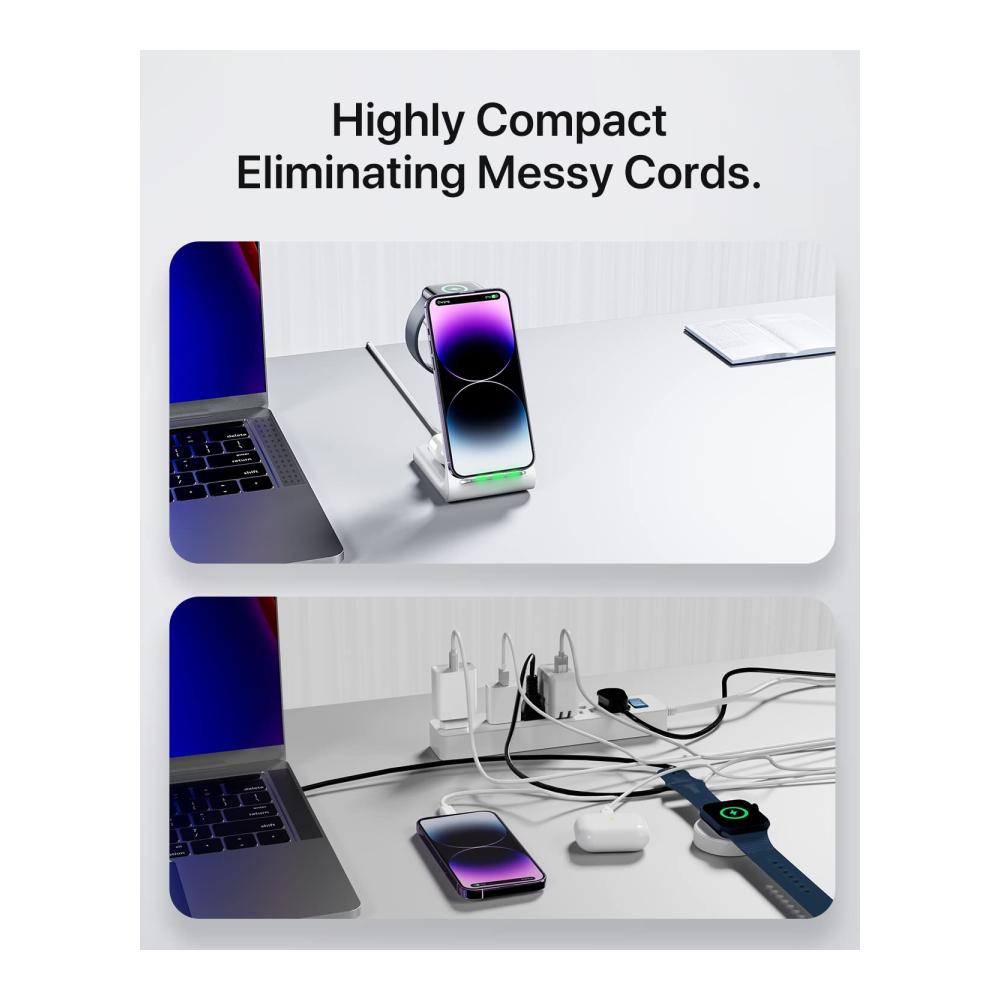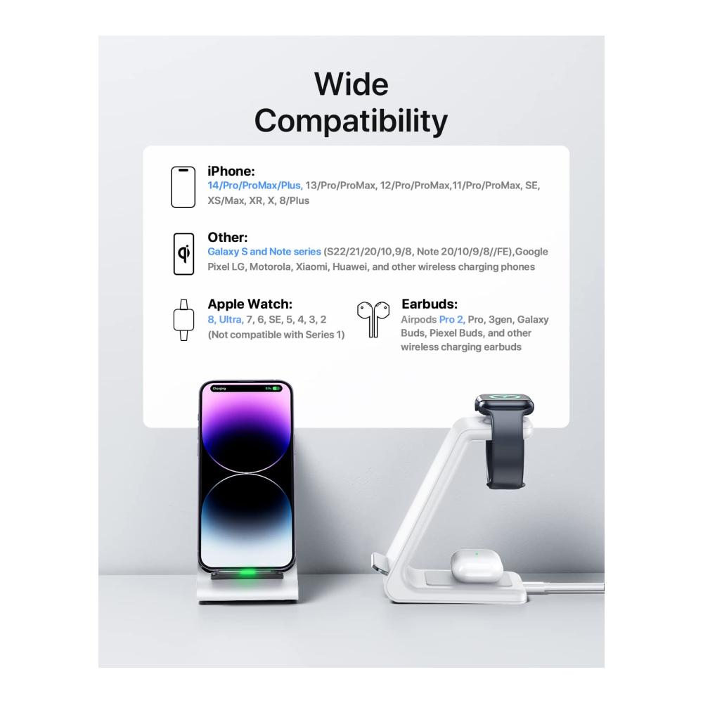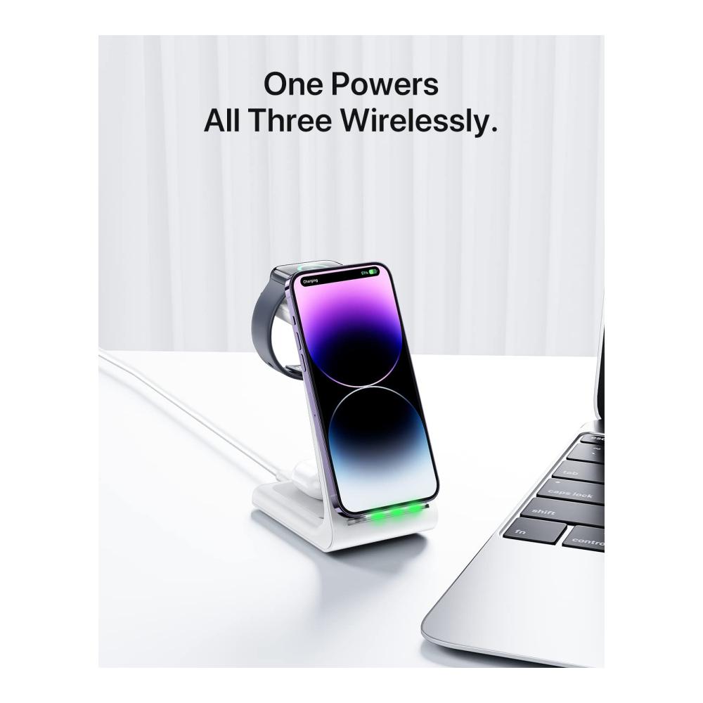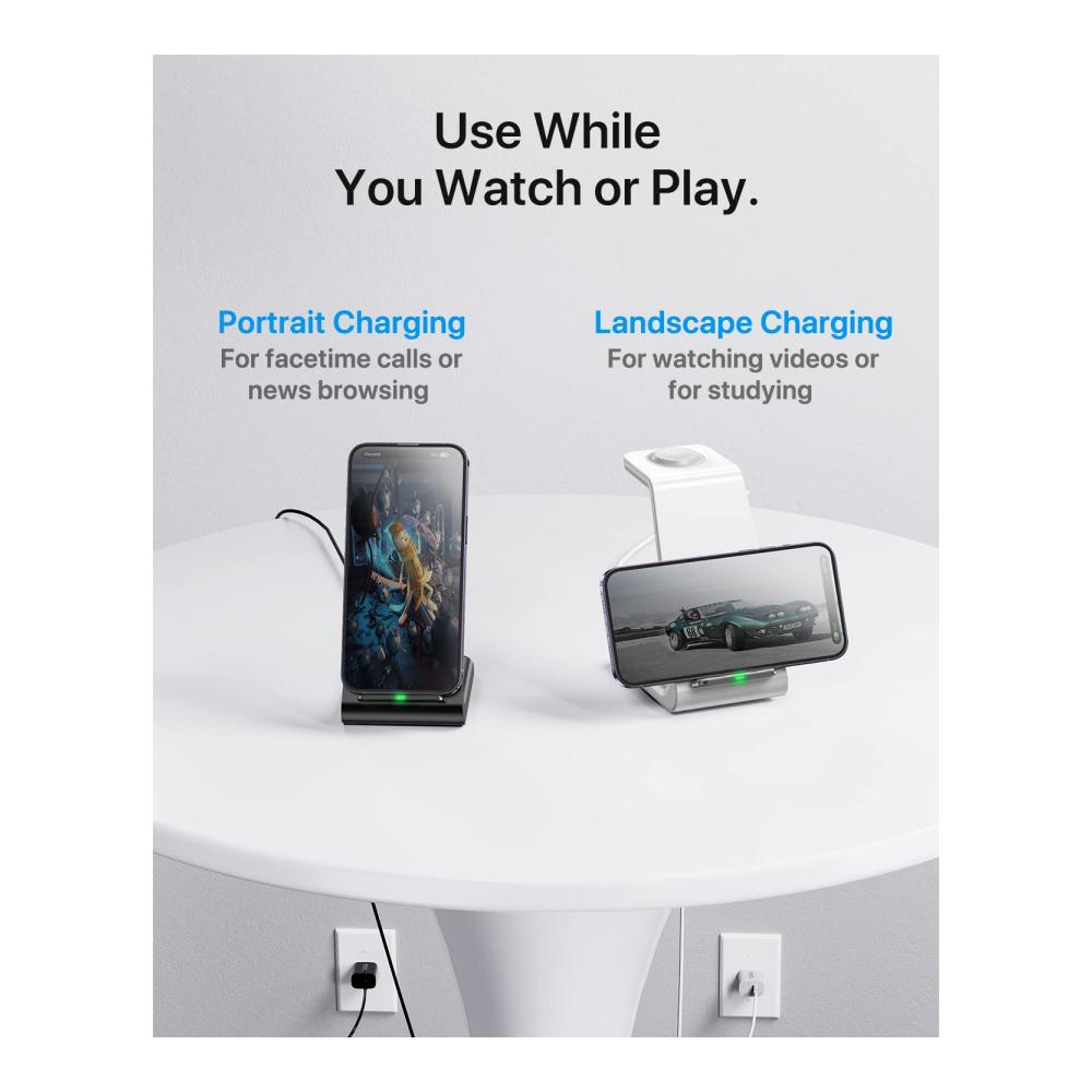 【Latest upgrade】The Qi-certified wireless charger stand with upgraded design and internal chip ensures safe and fast wireless charging. One charging device for your iPhone, iWatch, and Airpods. Suitable for home and office usage.(Attention: Only supports earpods with wireless charging cases)
