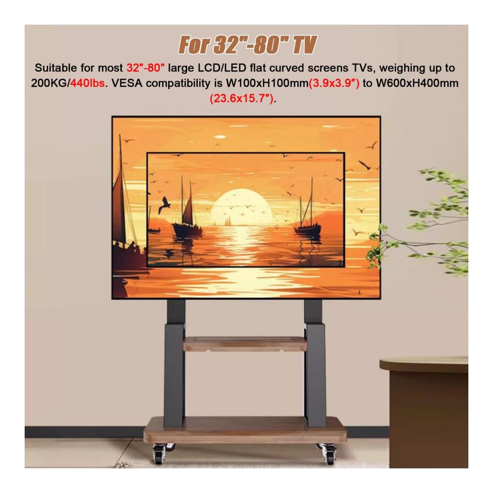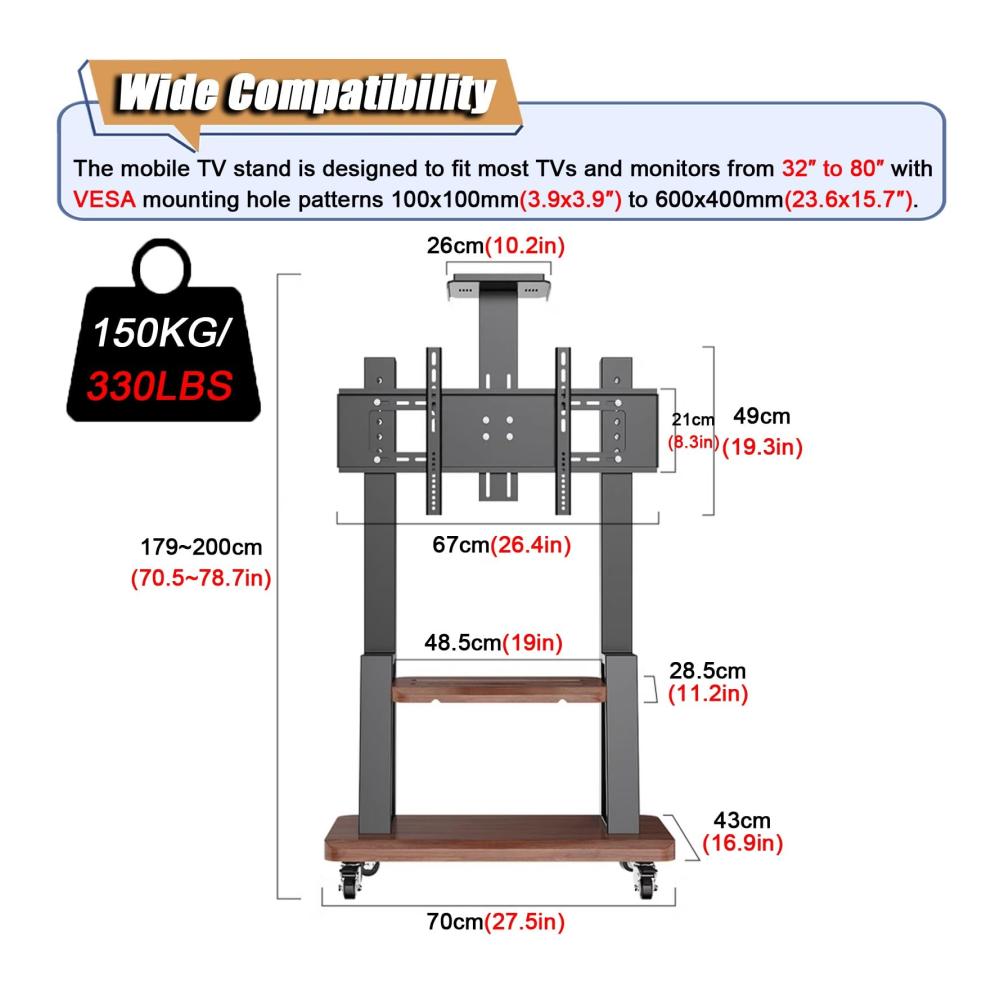 【Für 32-Zoll-80-Zoll-Fernseher】: Der tragbare TV-Wagen auf Rädern eignet sich für die meisten 32-Zoll-80-Zoll großen LCD-/LED-Flachbildfernseher mit gebogenem Bildschirm und einem Gewicht von bis zu 150 kg. Die VESA-Kompatibilität beträgt B100 x H100 mm (3,9 x 3,9 Zoll) bis B600 x H400 mm (23,6 x 15,7 Zoll). Universell mit den meisten TV-Marken auf dem Markt.