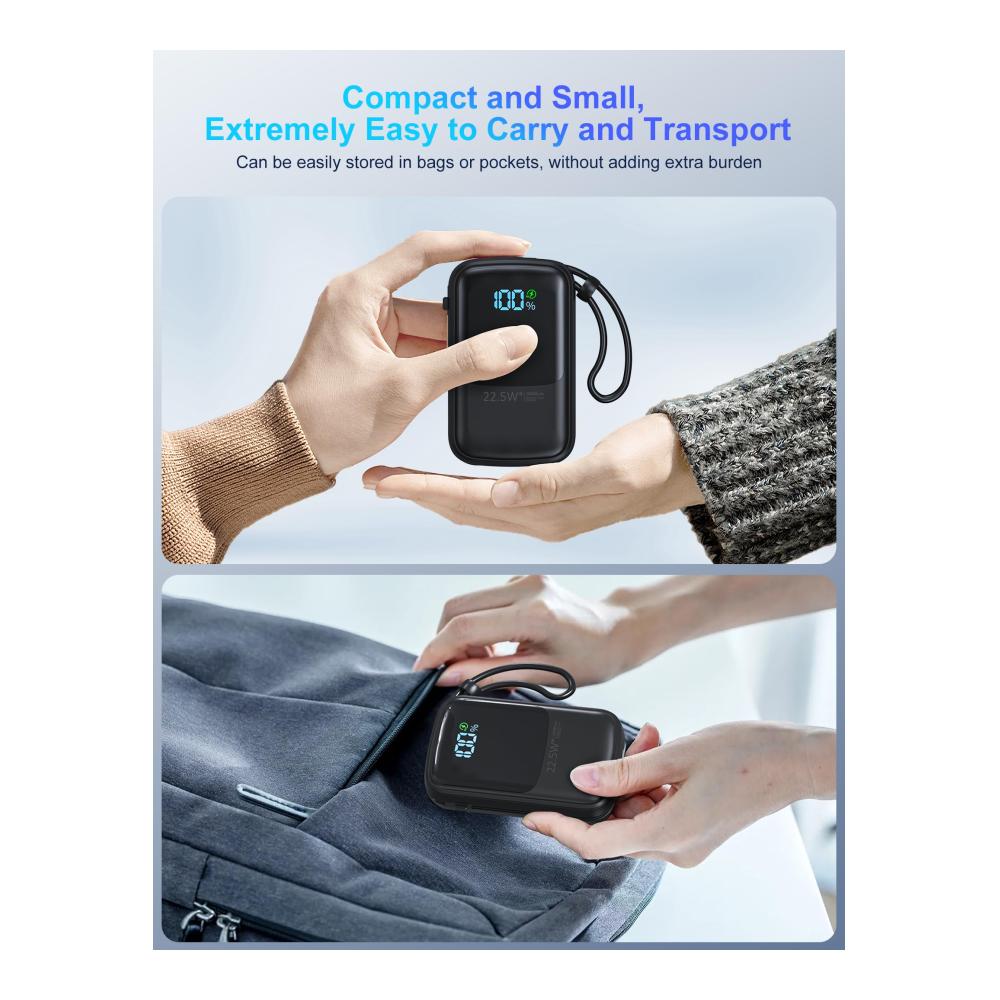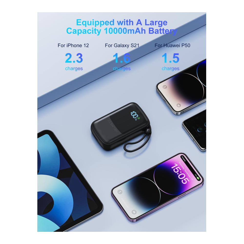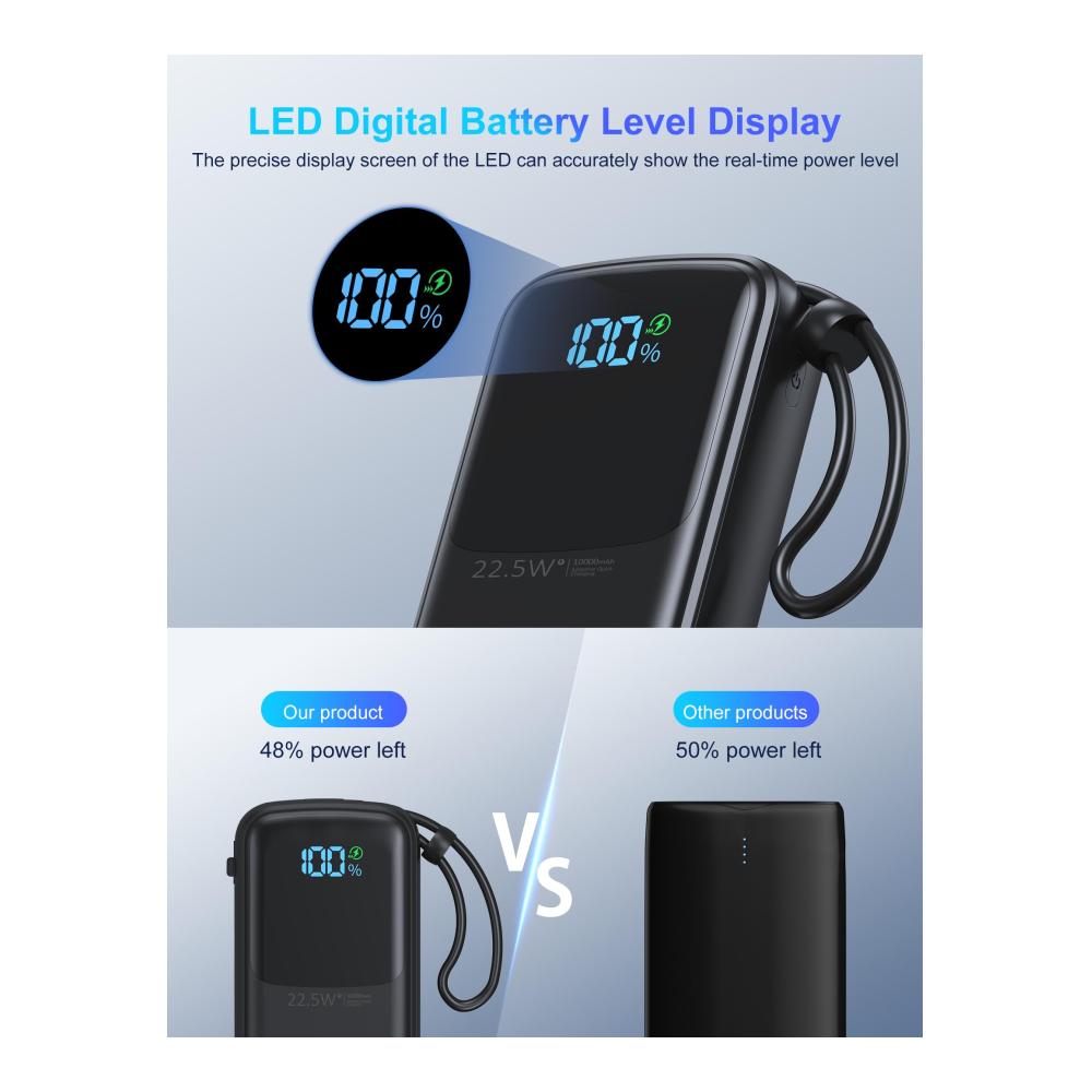 Rsesun Power Bank 10000mAh mit Kabel Externe Handyakkus – Schnelles Laden PD3.0 QC4.0 – 22,5W USB-C Ein- und Ausgang – LED Display – Tragbares Ladegerät für iPhone Samsung Huawei (Schwarz)
