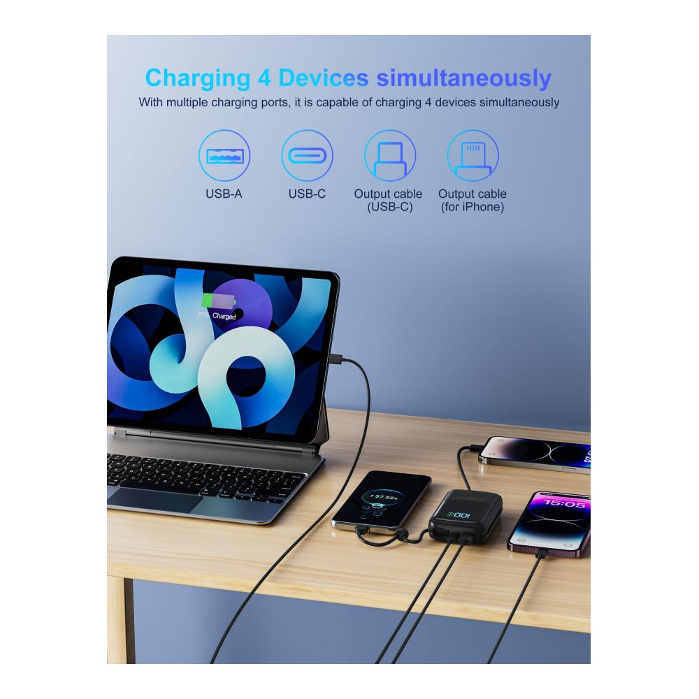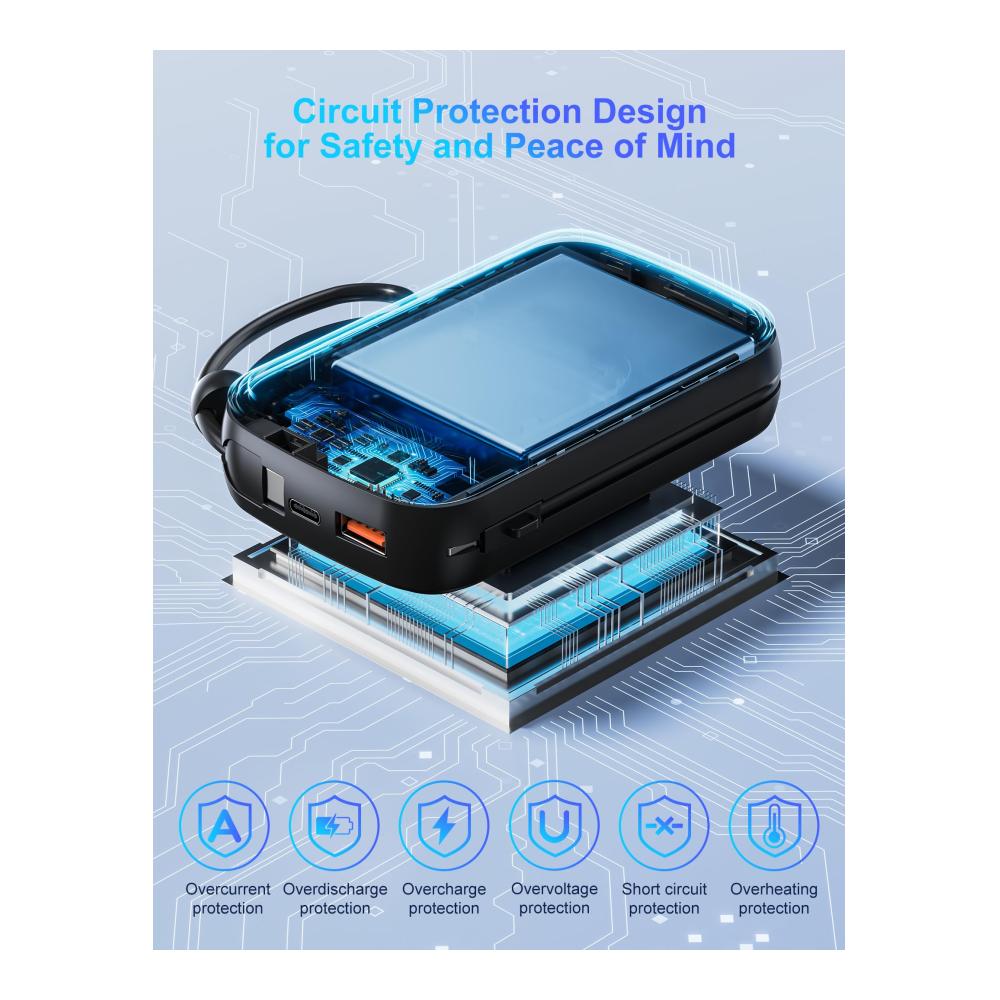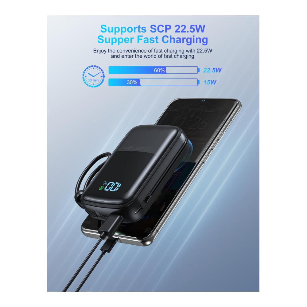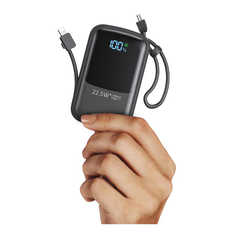 Rsesun Power Bank 10000mAh mit Kabel Externe Handyakkus – Schnelles Laden PD3.0 QC4.0 – 22,5W USB-C Ein- und Ausgang – LED Display – Tragbares Ladegerät für iPhone Samsung Huawei (Schwarz)