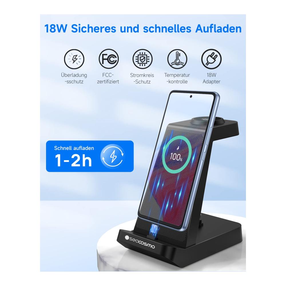 【Breite Kompatibilität】Die kabellose 3 in 1 Ladestation kann Ihre Galaxy Watch/Handys/Buds gleichzeitig aufladen, kompatibel mit Handys und Kopfhörern mit Typ-C-Ladeanschluss. Ausgestattet mit einem CE-zertifizierten 18W-Adapter und einem Typ-C-Kabel, die helfen, Ihre mehrere Geräte schneller und stabiler zu laden. Es dauert etwa 1-2 Stunden für eine volle Ladung. 🔋Hinweis: Nicht für Galaxy Watch 2, Gear S3, S2, S und iWatch.