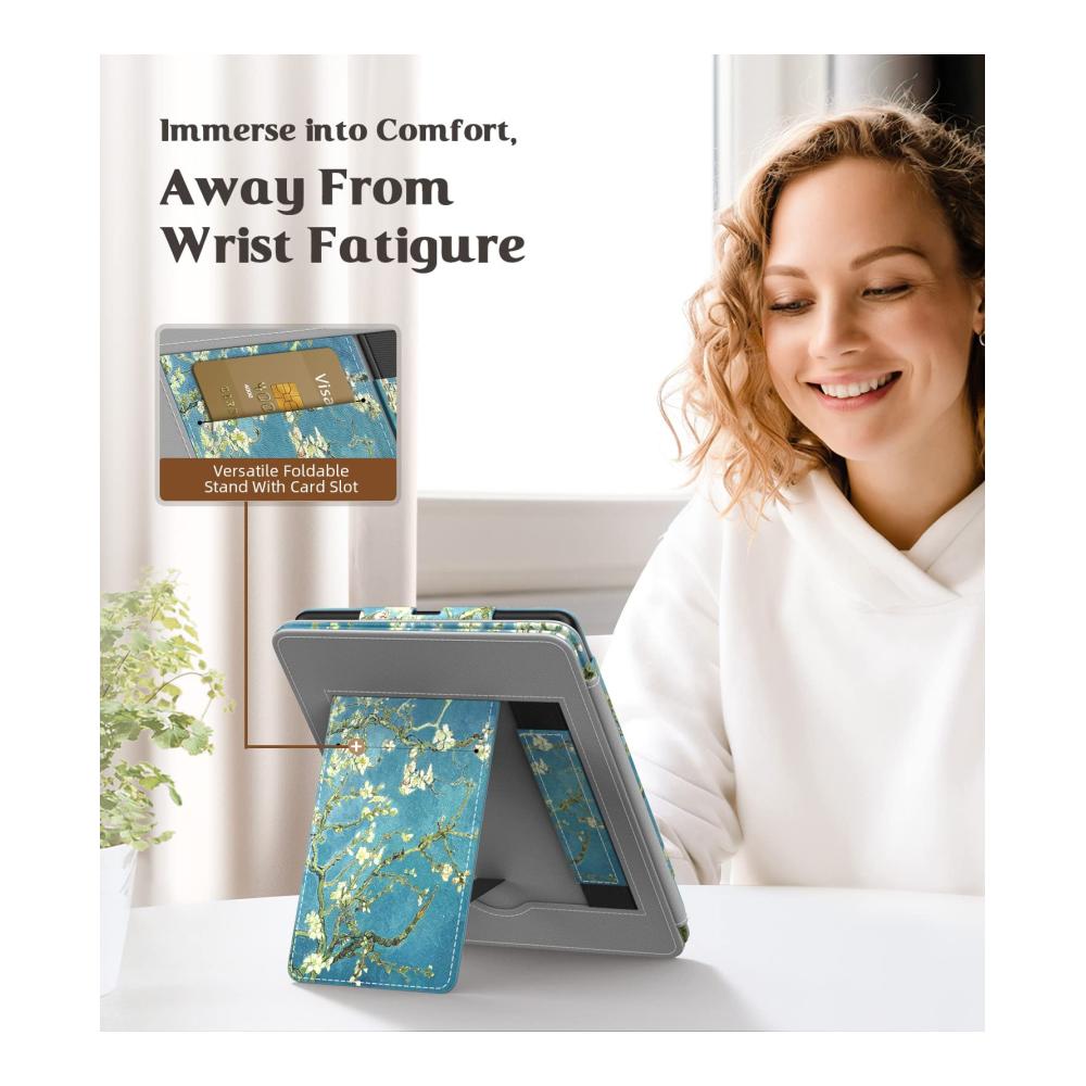 Dank des klappbaren Ständers können Sie die Lesezeit ohne Hände genießen. Außerdem ist es praktisch, Ihre Karten, Rechnungen usw. im Kartenschlitz aufzubewahren.