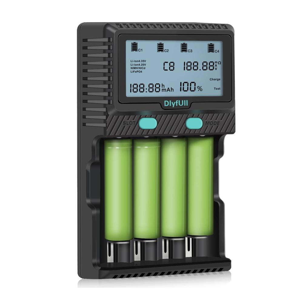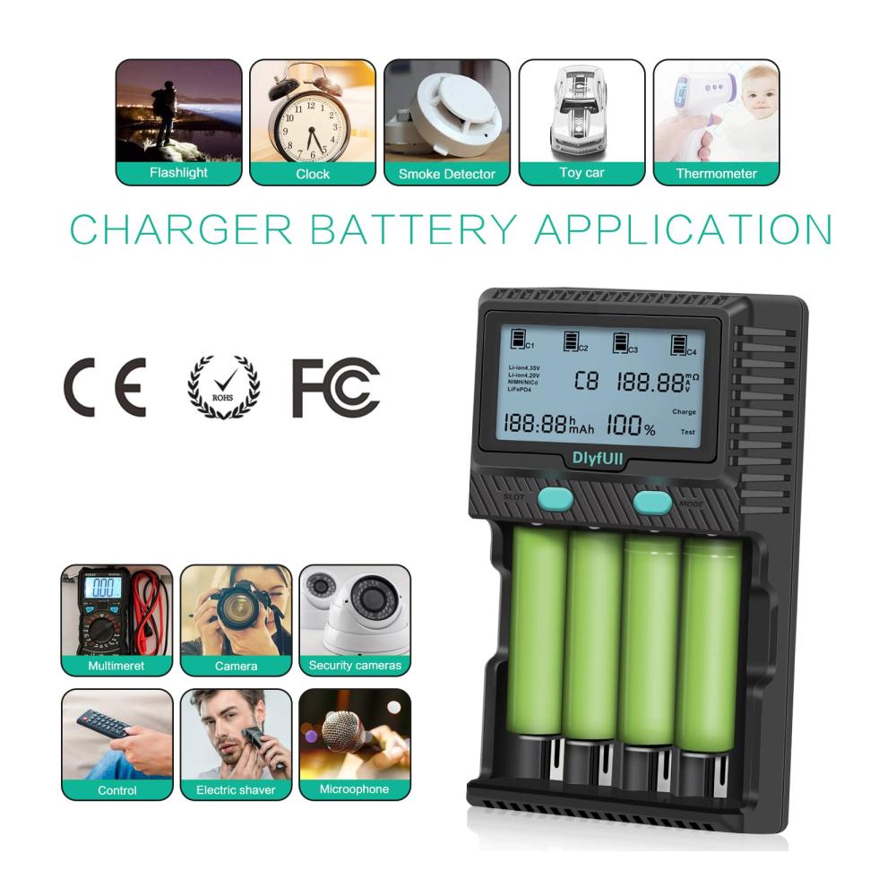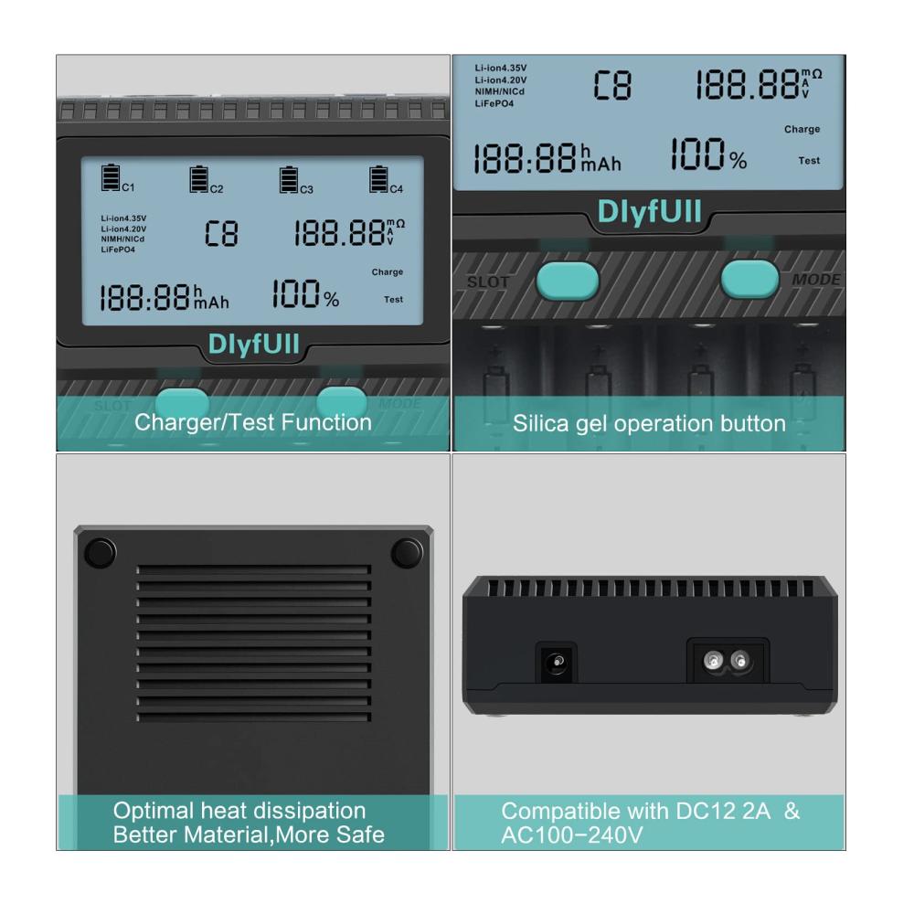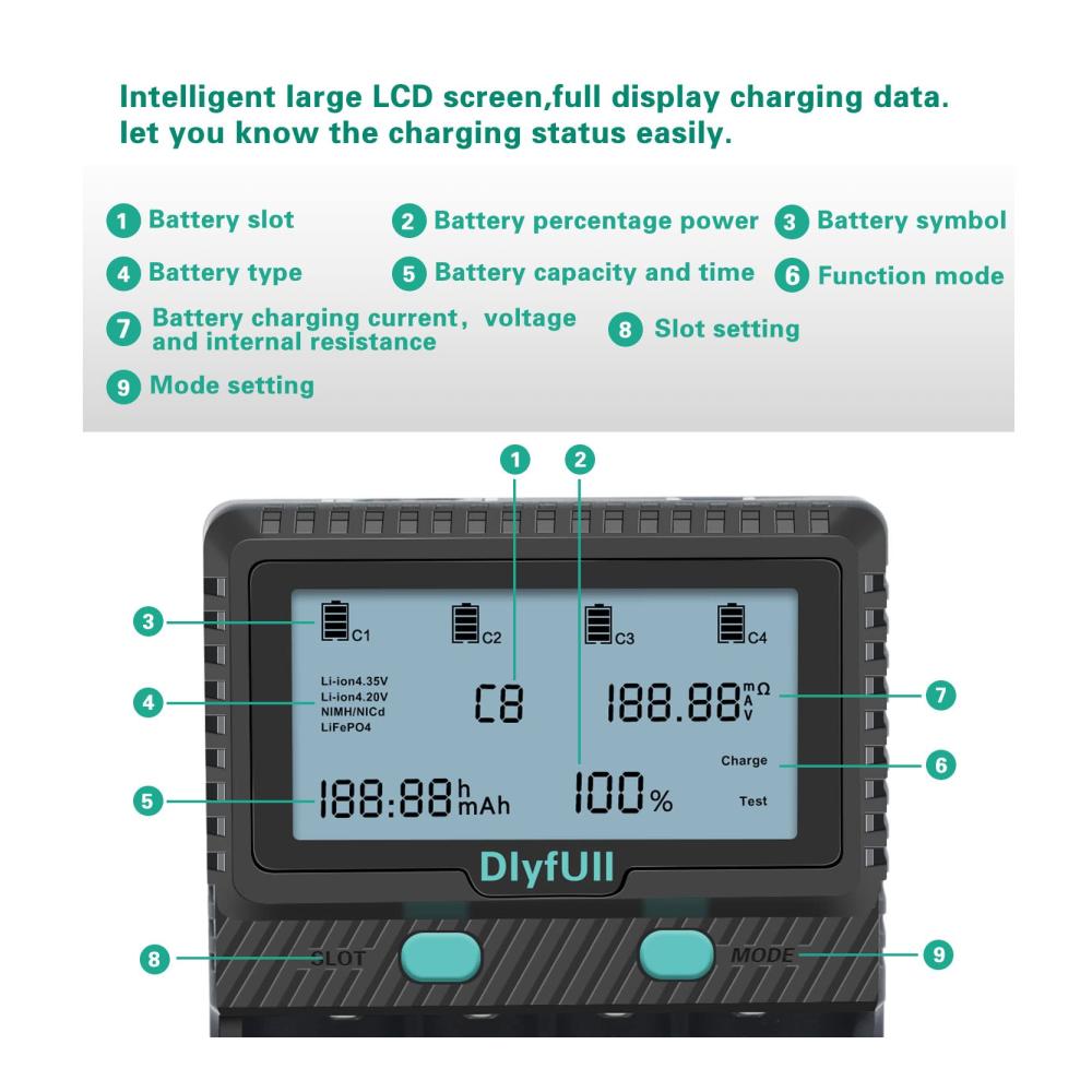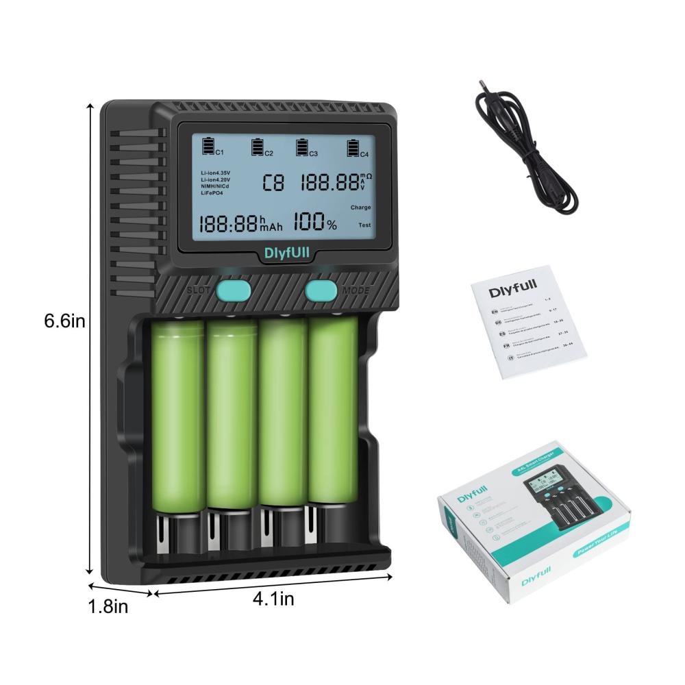 【Besonderheit】: Jede steckplatz kann Information für verschiedene Batterien zeigen(Inklusive 9-Volt-Batterie). Der 4. Ladeschlitz hat eine Entladungsfunktion, um die Akkulaufzeit verlängert. Ladestromoptionen: Li-Ion/LiFePO4 max. 2A*2(steckplatz 1 und 4) . Ni-MH / Ni-Cd max. 1A*4