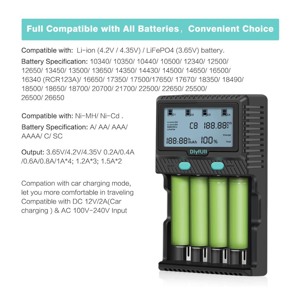 【Kompatibilität】: 9V, Li-Ion (4,2 V / 4,35 V) /LifePO4 (3,6 V): 10340/10350/10440/10500/12340/12500/12650/13450/13500/13650/14350/14430/14500/14650/16500/16340(RCR123)/16650/17350/17500/17650/17670/18350/18490/18500/18650/18700/20700/21700/22500/22650/25500/26500/26650/32650; Ni-MH / Ni-Cd; A AA AAA AAAA C SC D. Der eingebaute Mikroprozessor erkennt die Akkukapazität automatisch und wählt das geeignete Ladeverhalten.
