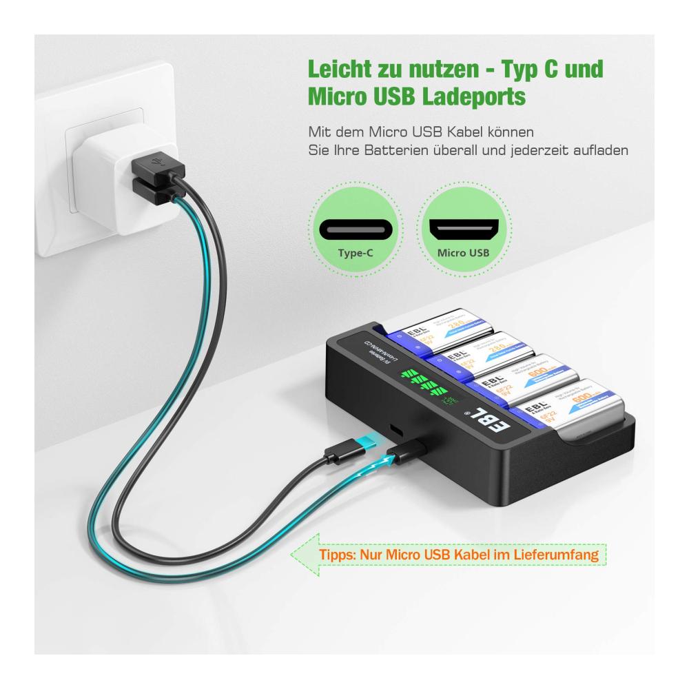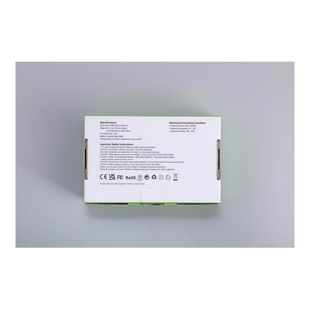Das EBL 9V Akkuladegerät bietet intelligente Ladung für Li-Ion, Ni-MH und Ni-Cd 9V wiederaufladbare Batterien. Mit 4 unabhängigen Ladeschächten können Sie Batterien einzeln oder gemischt aufladen. Dank der dualen Eingangsanschlüsse – Micro USB und Type C – ist dieses Ladegerät äußerst vielseitig einsetzbar. Der großzügige LCD Bildschirm zeigt den Ladestatus und Fehlerwarnungen an, während der Multi-Schutzmechanismus Überhitzung, Überladung, Überspannung und Kurzschlüsse verhindert, für eine sichere und effiziente Ladung.