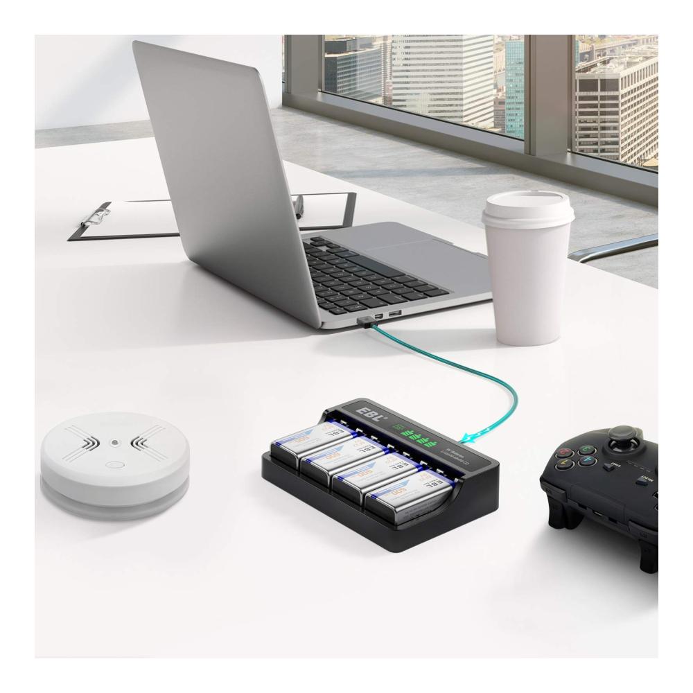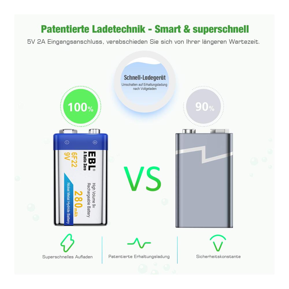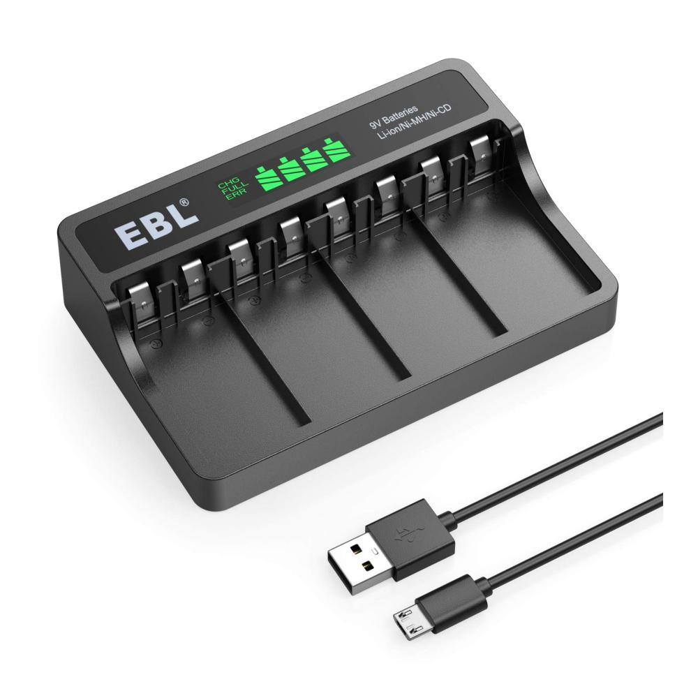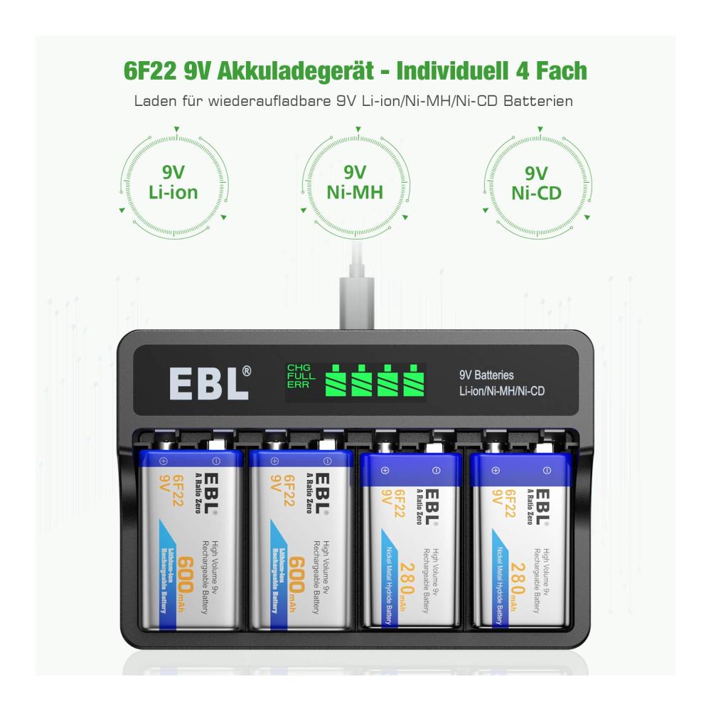 【Intelligente Ladung】 Das EBL 9V Akkuladegerät ideal für wiederaufladbare 9v Batterien von Multityp wie Li-Ion, Ni-MH und Ni-Cd.