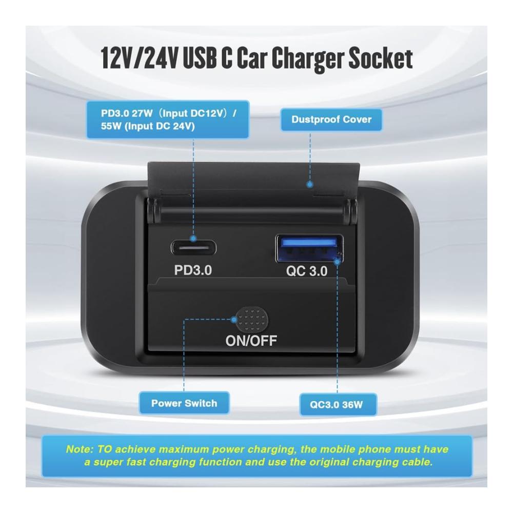 [Dual-USB-Ladebuchse] PD Typ C und QC3.0 USB-Autoanschluss. Mit der USB-C-Autosteckdose können kompatible Geräte gleichzeitig aufgeladen werden. Hinweis: Für maximale Leistung muss das Telefon über eine Superschnellladefunktion verfügen und das Original-Ladekabel verwenden.