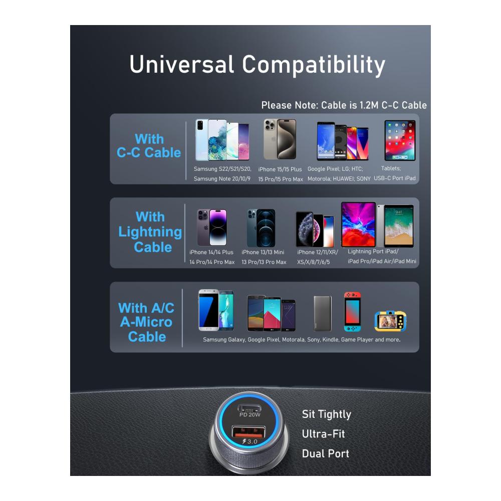 ▶【Widely Compatible】 USB C & A Autoladegerät, schnelles Aufladen Kompatibel mit Samsung Galaxy S23/S22/S21/S20/S10/S9/S8 , Note 20/10/9/8, A50/A51; LG G8/g7/G6/G5/G4/G3, LG V60/V50/V40/V30/V20; Motorola und weiteren QC-fähigen Geräten.