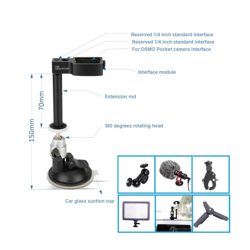 • ▶ Geeignet für: Das multifunktionale Autohalterungszubehör mit Saugnapf, geeignet für die DJI OSMO Pocket/Pocket 2 Kamera. Standardmäßige 3/8-Zoll- und 1/4-Zoll-Universalschnittstellen sind auf der Halterung reserviert, die an verschiedenen Geräten verwendet werden können.