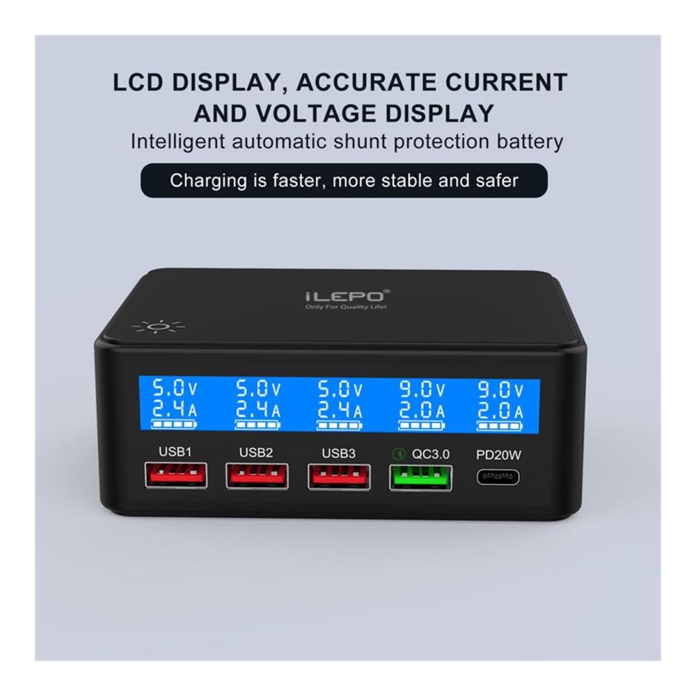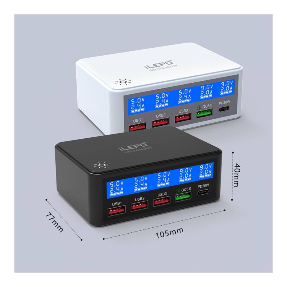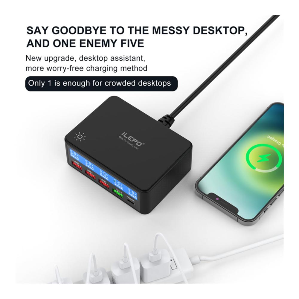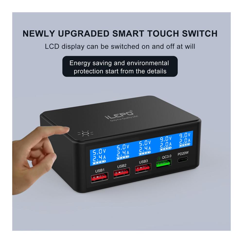 Mit seinem kompakten und leichten Design ist dieses Ladegerät perfekt für Reisen geeignet. Die eingebaute LCD-Anzeige zeigt den Ladestatus jedes Anschlusses an und der intelligente Touch-Schalter ermöglicht es, die Hintergrundbeleuchtung des Displays nach Bedarf zu steuern.