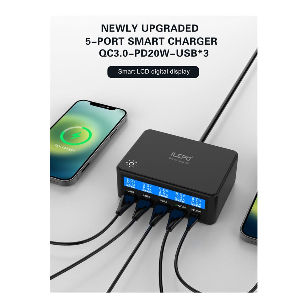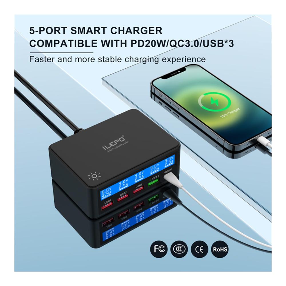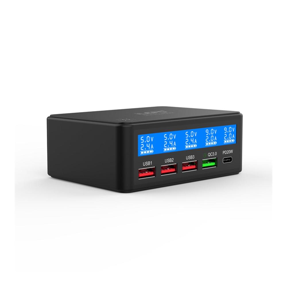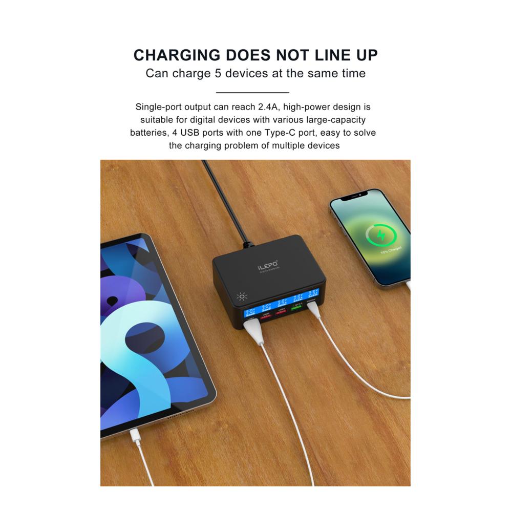 Mit seinem kompakten und leichten Design ist dieses Ladegerät perfekt für Reisen geeignet. Die eingebaute LCD-Anzeige zeigt den Ladestatus jedes Anschlusses an und der intelligente Touch-Schalter ermöglicht es, die Hintergrundbeleuchtung des Displays nach Bedarf zu steuern.