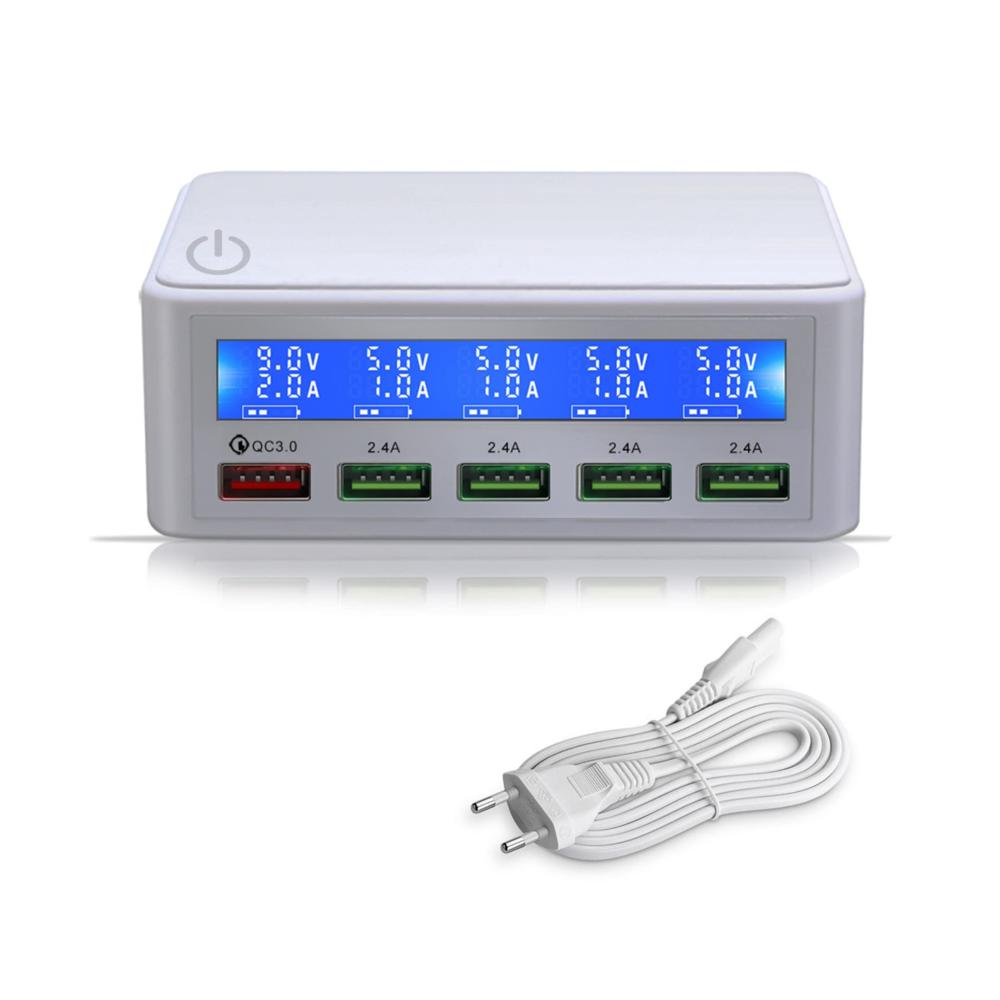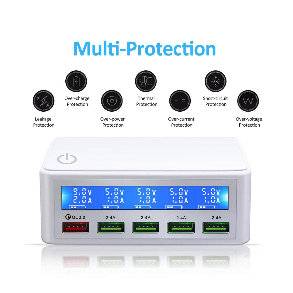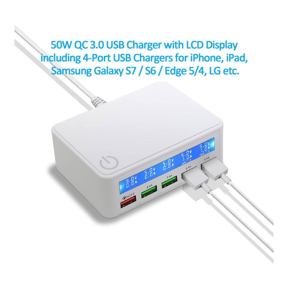 Entdecken Sie das USB Ladegerät Mehrfach 50watt mit Quick Charge 3.0 Schnellladen und Anzeige, das Ihr Leben mit hochwertiger Ladetechnologie bereichert. Mit fünf USB-Anschlüssen bietet es schnelles Aufladen für eine Vielzahl von Geräten wie Tablets, Kopfhörer, Spielkonsolen, Handys und Smartwatches. Das elegante Design in Weiß passt perfekt zu Ihrem modernen Lebensstil. Dank seiner intelligenten Funktionen wie der Ladeanzeige und dem automatischen Ausschalten ist es ideal für Reisen und den täglichen Gebrauch. Jetzt erhältlich, um Ihre digitalen Geräte immer einsatzbereit zu halten.