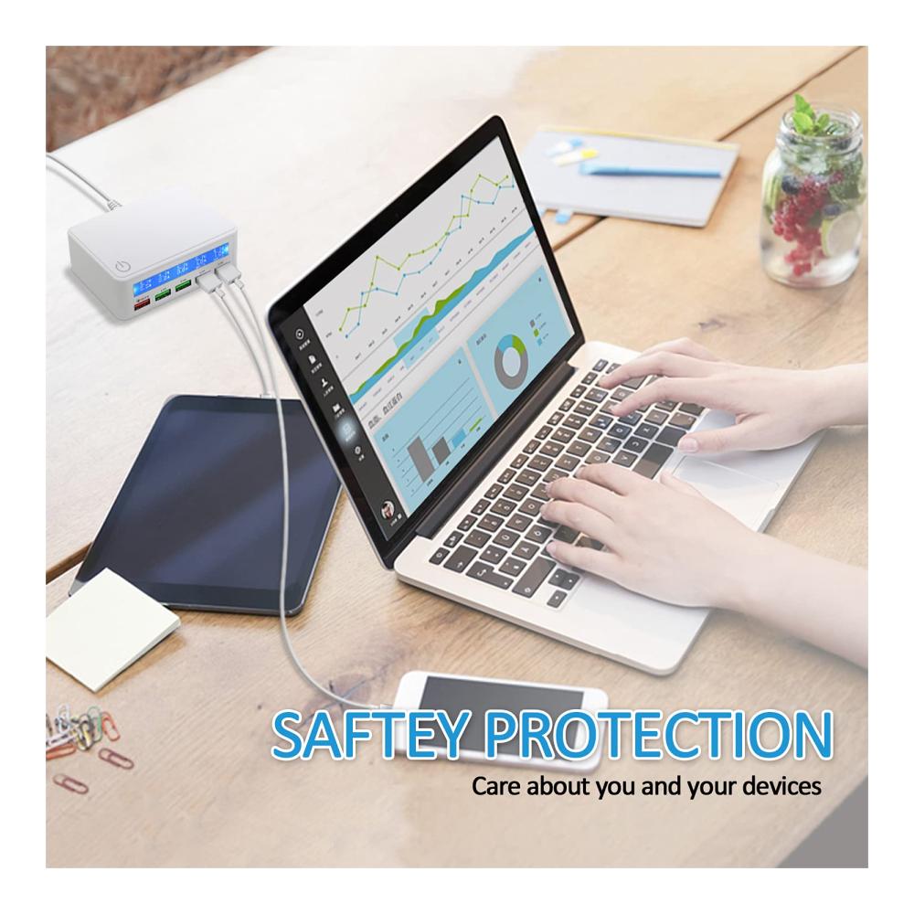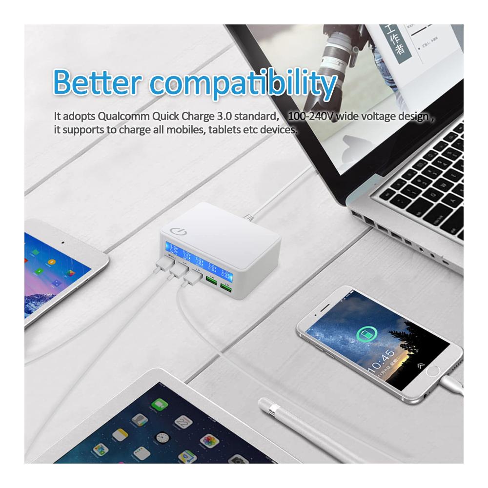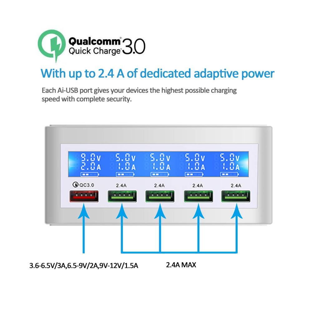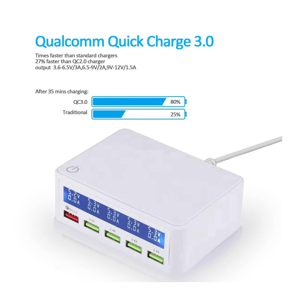 Entdecken Sie das USB Ladegerät Mehrfach 50watt mit Quick Charge 3.0 Schnellladen und Anzeige, das Ihr Leben mit hochwertiger Ladetechnologie bereichert. Mit fünf USB-Anschlüssen bietet es schnelles Aufladen für eine Vielzahl von Geräten wie Tablets, Kopfhörer, Spielkonsolen, Handys und Smartwatches. Das elegante Design in Weiß passt perfekt zu Ihrem modernen Lebensstil. Dank seiner intelligenten Funktionen wie der Ladeanzeige und dem automatischen Ausschalten ist es ideal für Reisen und den täglichen Gebrauch. Jetzt erhältlich, um Ihre digitalen Geräte immer einsatzbereit zu halten.