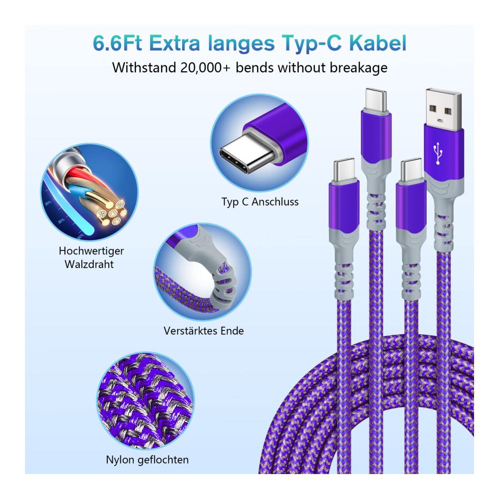 【2 Stück Ladekabel USB C】: Schnellladegerät mit 2 6.6Ft 60W USB C Ladekabel perfekt kompatibel mit allen Android und USB C Geräten. Verfügt über bruchfestes SR und verschleißfestes Nylon, das mehr als 20.000 Biegetests standhalten kann, ohne zu brechen. 6.6ft/2M USB-C-Kabel ist bequem für Sie bei der Arbeit und zu Hause zu verwenden, mit verschiedenen Anschlüssen, um die Bedürfnisse der verschiedenen Ladegeräte zu erfüllen.