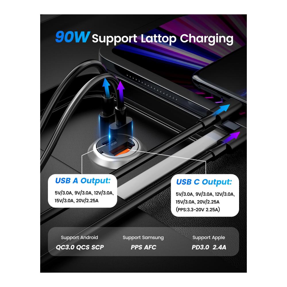 Dank seiner vielseitigen Kompatibilität können Sie eine Vielzahl von Geräten, einschließlich Handys, Laptops, Kopfhörern, iPads und mehr, aufladen. Das blaue LED-Licht erleichtert das Auffinden des Anschlusses, auch bei Dunkelheit. Mit einem schlanken und kompakten Design ist es ein praktisches und stilvolles Zubehör für Ihr Auto.
