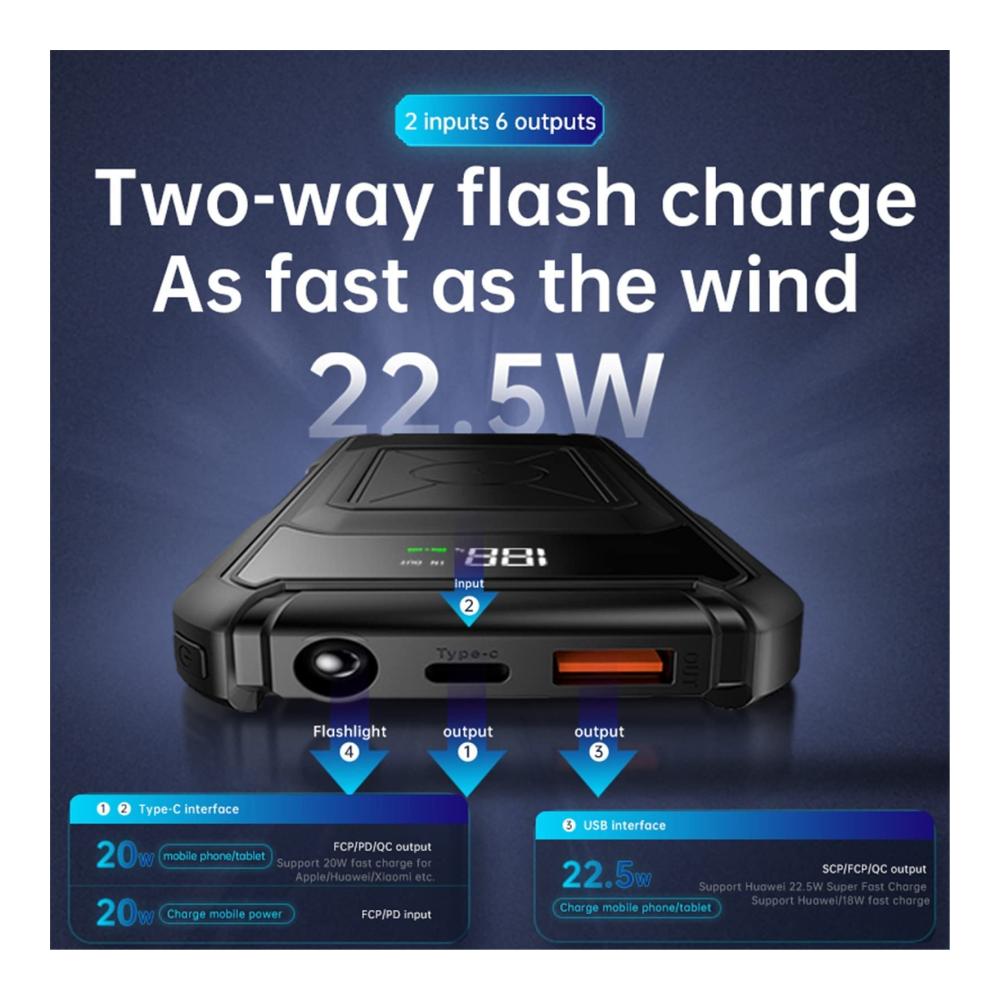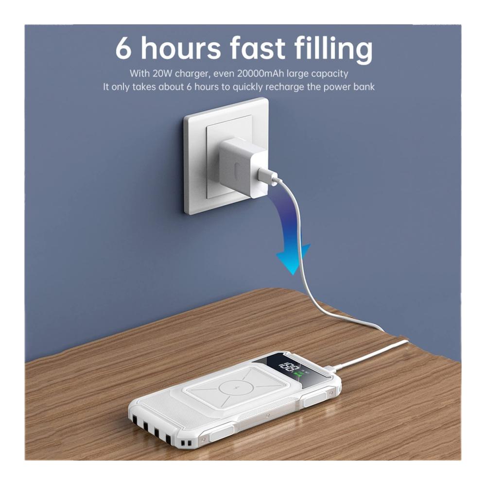 Herzlich willkommen bei unserem innovativen 15 W Qi Wireless Charger und Powerbank. Diese leistungsstarke 20000 mAh Powerbank ist die ideale Lösung für unterwegs, um Ihre Geräte schnell und kabellos aufzuladen. Mit 22,5 W QC PD 3.0 Schnellladeunterstützung bietet sie eine beeindruckende Ladeeffizienz.