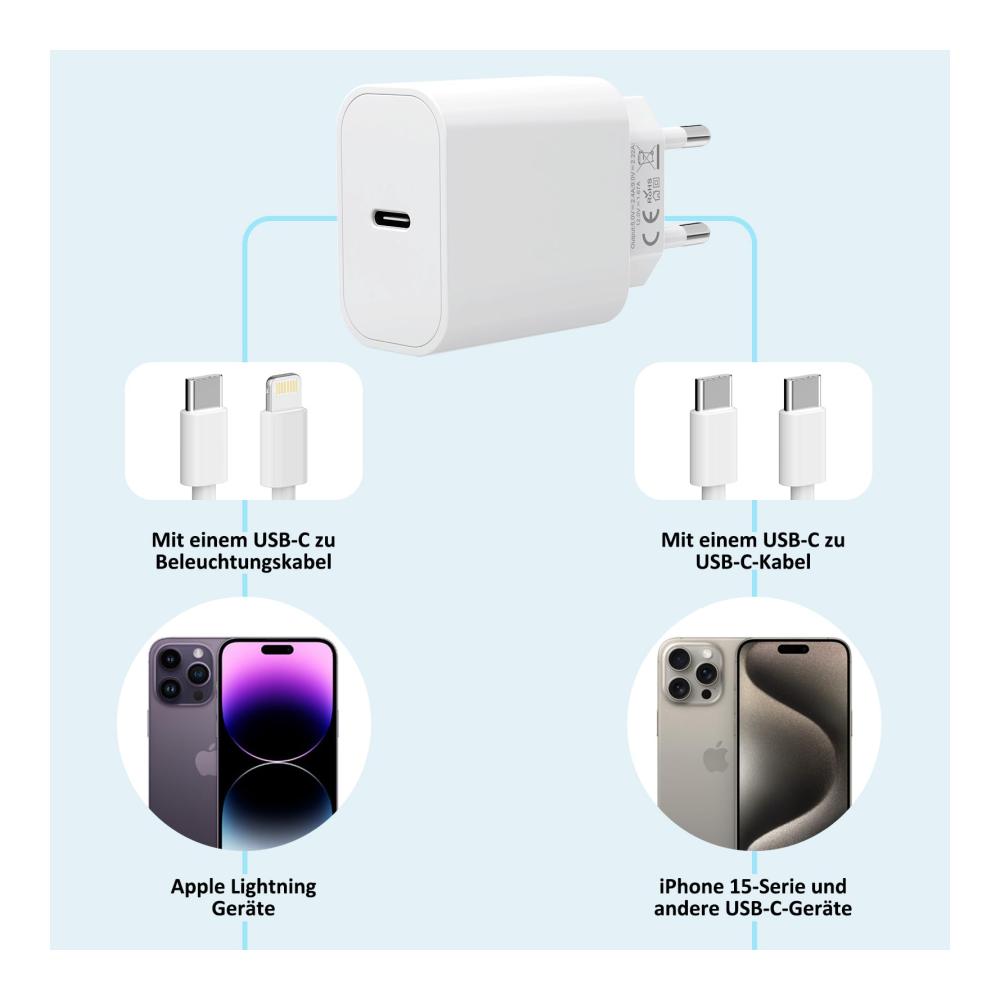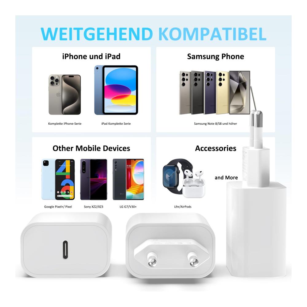 Unser USB C Ladegerät ist universell kompatibel mit einer Vielzahl von Geräten, einschließlich iPhone 15/14/13 Serie, Samsung Galaxy, iPad und mehr. Mit feuerfesten Materialien und einem intelligenten Chip gewährleisten wir eine ultra lange Lebensdauer und sicheres Aufladen. Bitte beachten Sie, dass ein USB-C-auf-Lightning-Kabel für iPhones erforderlich ist (nicht im Lieferumfang enthalten).