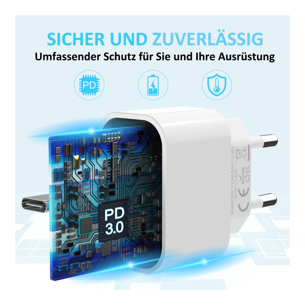 Sicher und zuverlässigDer ZNBTCY USB C Ladegerät bietet eine Schnellladung von bis zu 25 Watt. Die Ladegeschwindigkeit ist dreimal schneller als das ursprüngliche 5W-Ladegerät und kann das iPhone 15/14/13 in 30 Minuten von 0% auf 50% aufladen. Sie können drei Geräte gleichzeitig laden. | Dreiteiliges Intellektuelles Ladegerät-SetDer intelligente Chipsatz dieses USB-C-Ladegeräts kann den vom Gerät benötigten Strom automatisch erkennen. 25W USB C Adapter Praktisches dreiteiliges Schnellladeset, Schnellladegerät Netzstecker Charger Schnellladestecker für iPhone/Samsung und andere digitale Geräte (Unser Paket beinhaltet keine Ladekabel). | Perfekt für jede GelegenheitUSB-C-Ladegerät super tragbar, einfach in der Tasche zu verstauen und überall hin mitzunehmen. Diese Fastenladungsausrüstung ist ideal für zu Hause, Büro, Restaurant, Tour, Hotel usw. |