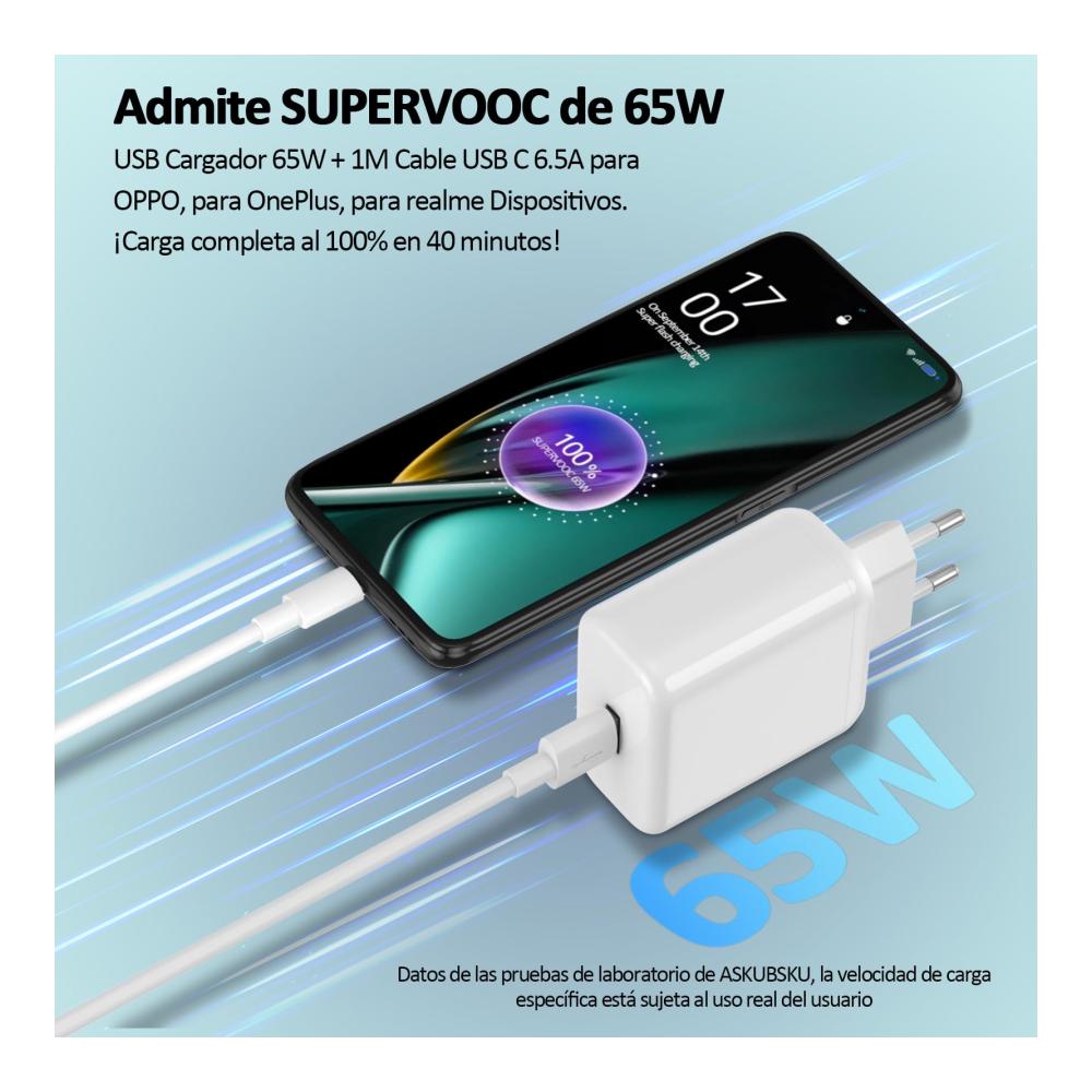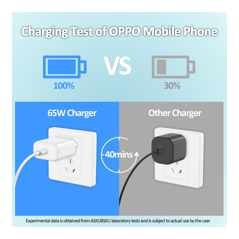 Aktualisiertes USB-Kabel und 65 W Ladegerät: Das USB-A-Ladegerät unterstützt 65 W SUPERVOOC und kann in ca. 40 Minuten bis zu 100% aufgeladen werden. Mit Überladungsschutz verlangsamt es die Ladegeschwindigkeit, wenn Sie einen bestimmten Ladezustand erreichen. Es unterstützt auch die Schnellladung mit 33 W, 30 W und 18 W von OPPO. Telefone mit weniger als 65 W benötigen mehr als 1 Stunde, um 100% aufzuladen.
