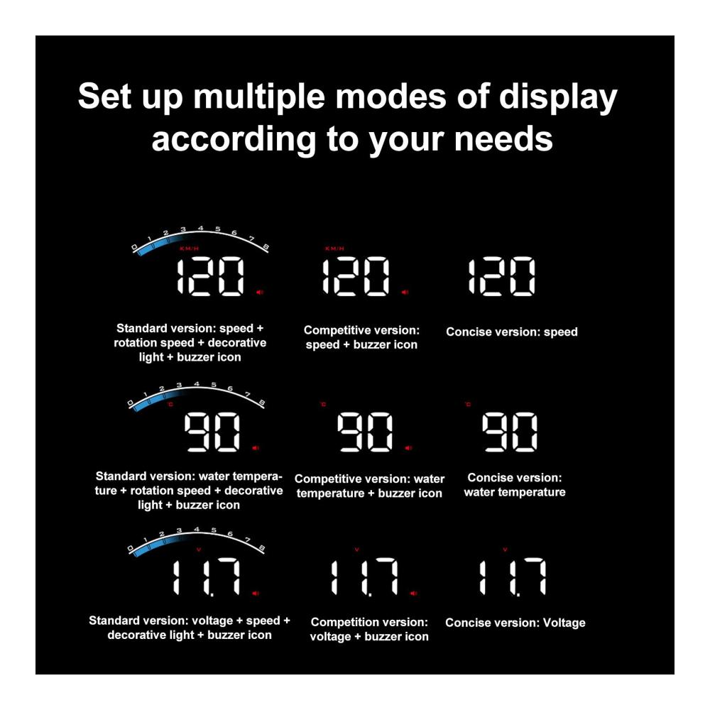 【Multiple operation interface modes】On-Board Diagnostics HUD with Multiple operation interface modes can be switched freely to meet different needs and bring you more convenience.With overspeed alarm, voltage alarm, water temperature alarm, fatigue driving reminder, fault alarm,provide you with a good experience